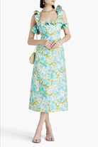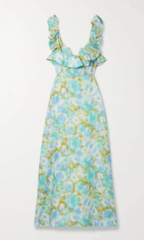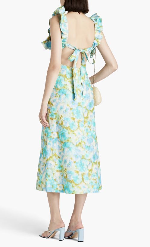 The High Tide Frilled Midi in Aqua Ikat Floral from Zimmermann is a  linen midi dress featuring a square frilled neckline and frill straps, boning at bodice side seams and finished with a cutaway back and self tie closure. This dress has an invisible zip closure at centre back. Perfect for both day and night time events.