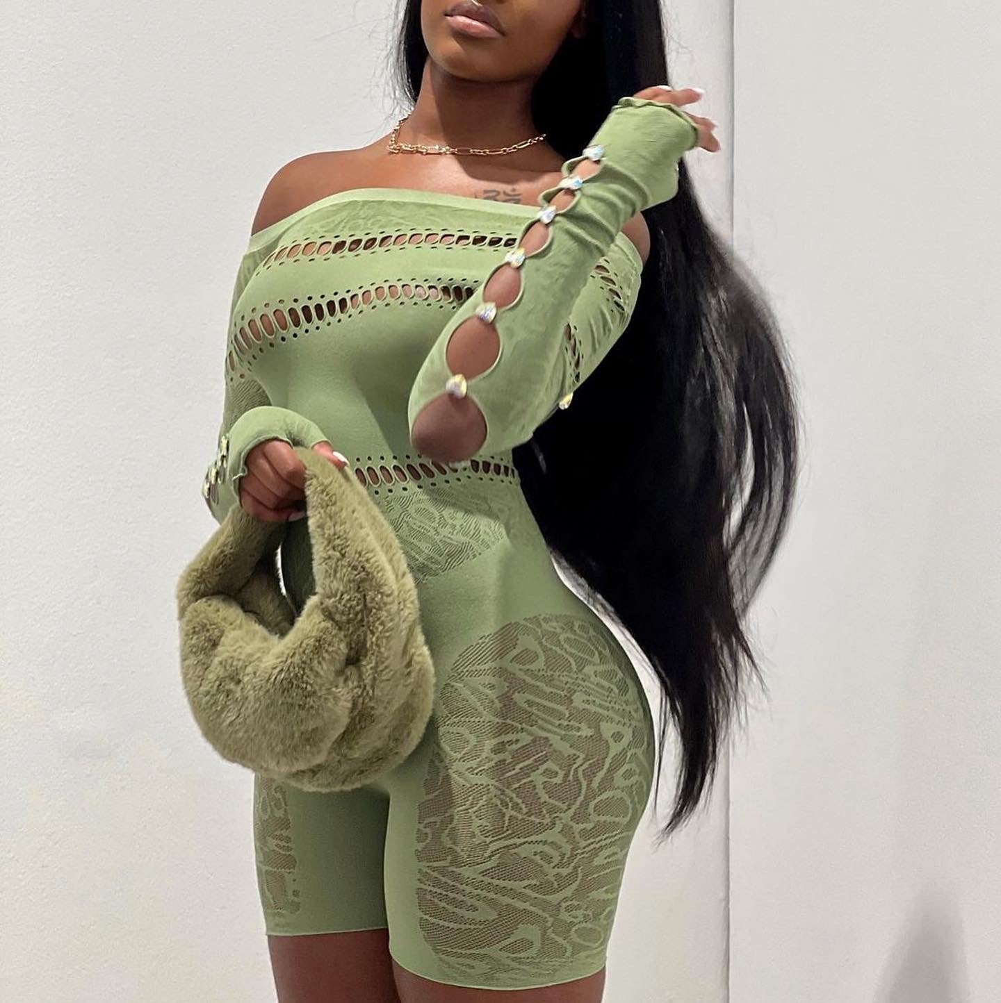 • ONE SIZE FITS ALLThe AW22 Ivy Jumpsuit is uniquely designed with asymmetric cut out details and contrasting textures. This jumpsuit features an off-shoulder detail and shorts to expose the legs and decolletage.POSTER GIRL's shapewear category is designed to suction you in all the right places, releasing and supporting your natural curves where needed.