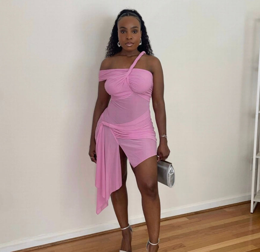 Size S* Stretch jersey* Twist design* Asymmetric hem* Mostly unlined, semi sheer* Back zip closure