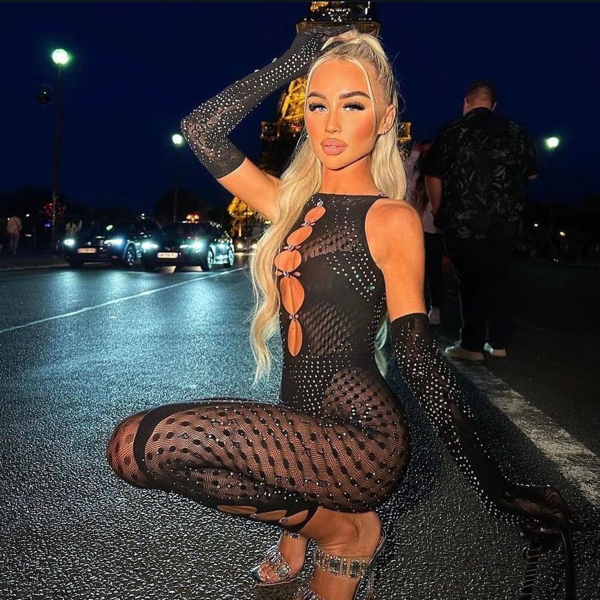 The Rhinestoned Janice Jumpsuit really needs no introduction. Worn by the likes of Vanessa Hudgens, Bia, Charli XCX, SZA, Izabel Gourlart, Stefflon Don & Jordyn Woods to name a few, this romper is a certified party staple.Murmurations of iridescent rhinestones swarm front & back, iconic cutout peep holes descend on the bust & legs, and our signature suctioning shapewear sweeps your curves to perfection.