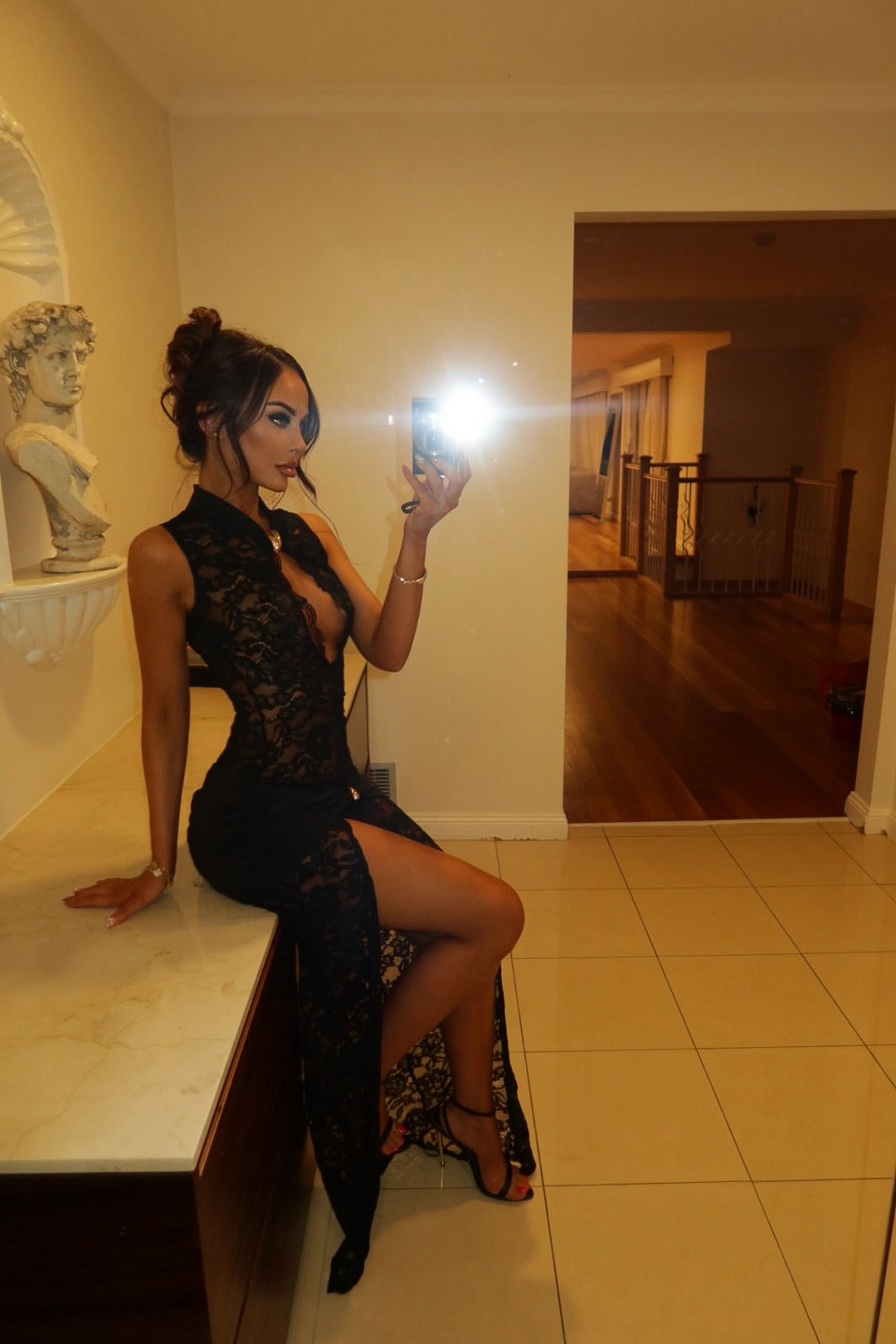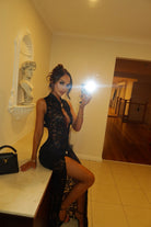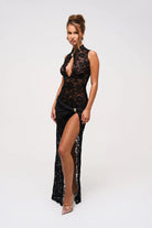 Set hearts racing in our Lace Keyhole Maxi Dress in Black.• Maxi length.• Thigh-high split.• Opaque overlay skirt.• Mock neck detail.• Keyhole bust detail.• Gold colour hardware on the neckline.• Lace fabric throughout.• Fabric is light stretch.• Sheer look.Style with a sleek updo and gold accessories for an elevated summer look.