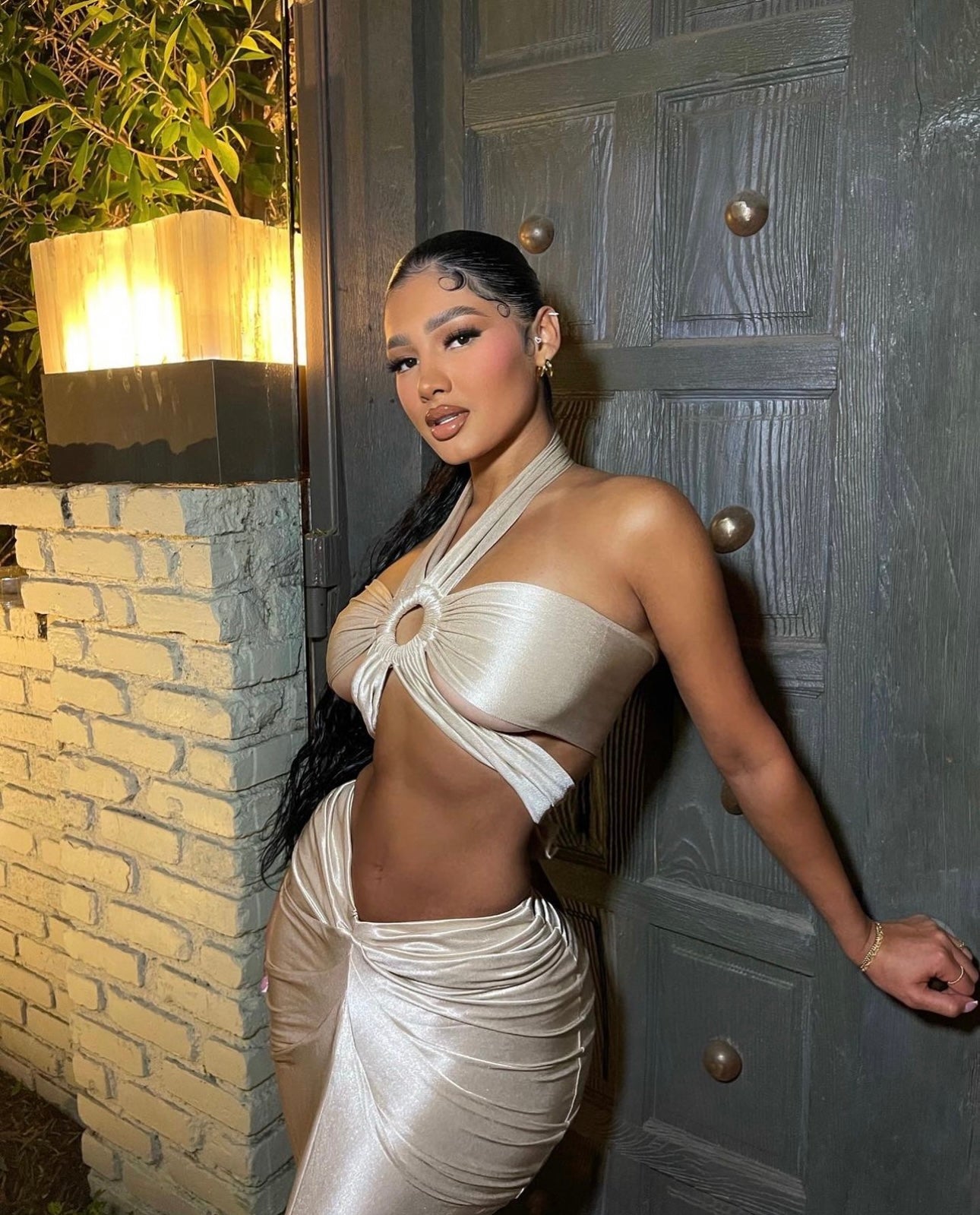 Halter crop top in Oyster. Ties up at the back to lift and secure. Made in a slinky, glowy fabric.