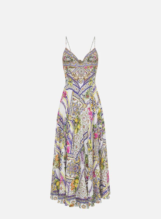 The Amalfi Amore Long Dress With Tie Front celebrates the vista views through iconic archways lined with fragrant florals at the Hotel Santa Caterina. Adorning crystal embellishments, this luxury CAMILLA linen maxi dress plays host to tie detailing at the sweetheart neckline, a fitted waist to cinch and shape, delicate shoestring straps and a full length silhouette that falls into a flared hemline. Lovingly handcrafted, designed in Australia. Explore more from the Amore Mio collection.Features- CAMILLA Ready-To-Wear- Full length- Front tie closure- Lined bodice- Lightweight Linen- Invisible side zip- True to sizeFabrication100% LINEN
