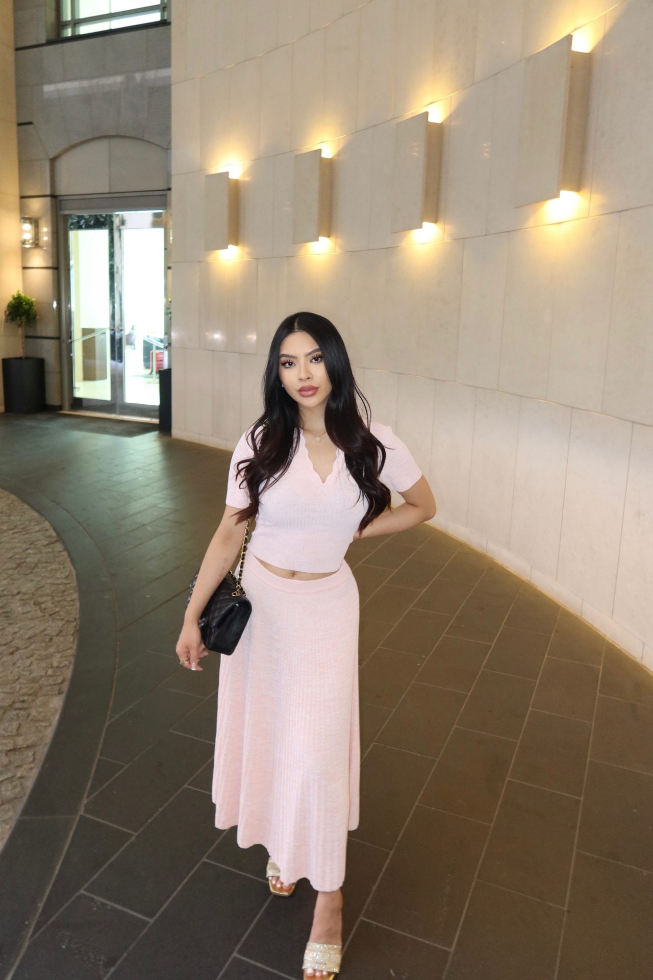 The top has been tailored, so will have a tighter fit around the waist compared to the model photo on the website..The top is a XS and the skirt is a S, but the material is very stretchy and will fit size 6-10. The fabric is extremely luxurious which is made out of viscose and polyamide