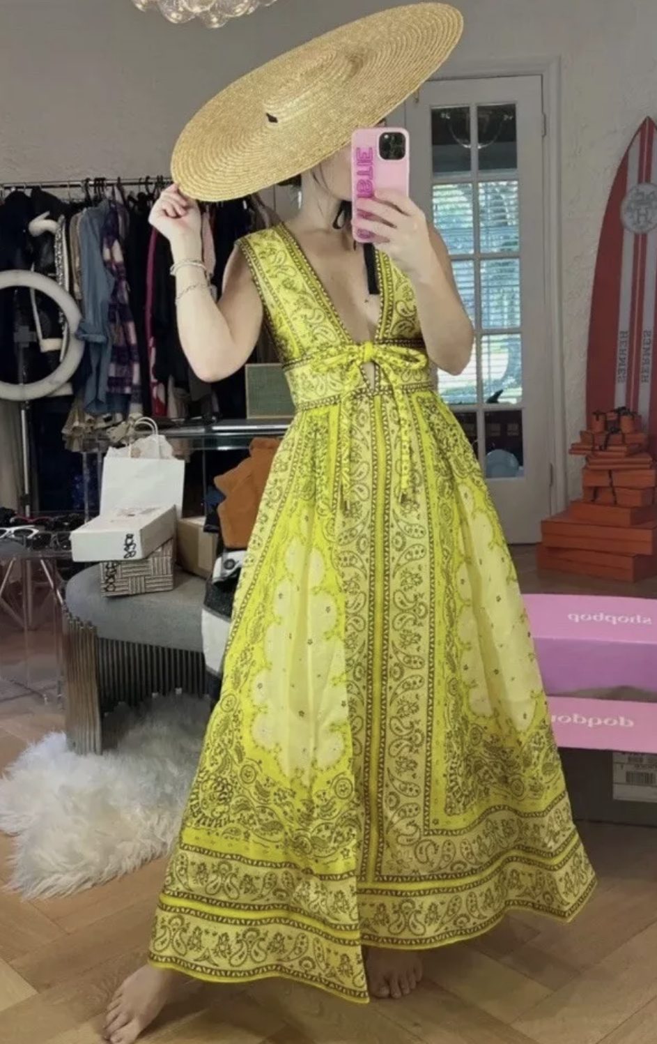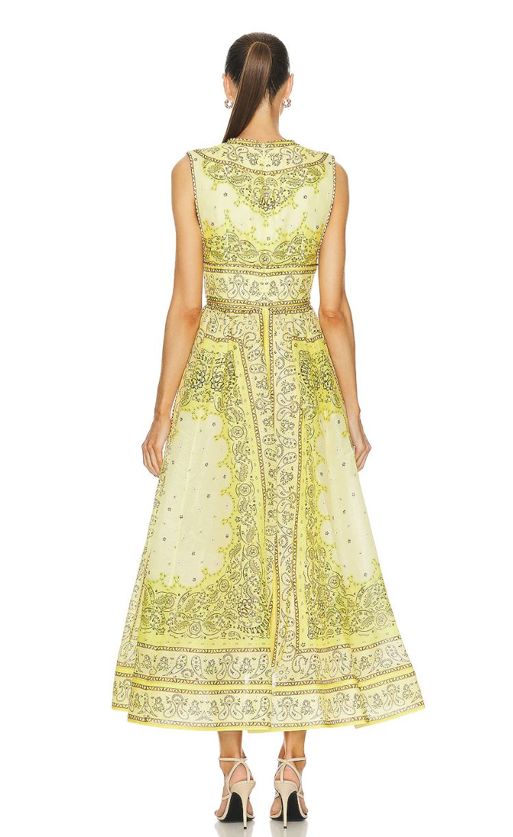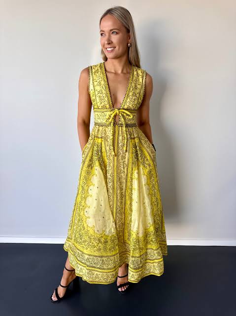 The Matchmaker Bow Long Dress in Yellow Bandana is a silk linen organza dress featuring a plunging neckline and full maxi skirt, finished with a bow detail and placement print throughout. It is composed of boning in the bodice, side seam pockets, and a crinoline hem and is finished with an invisible zip closure. Zimmermann has created a stunning maxi dress that is perfect for all occasions.