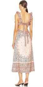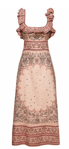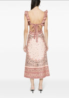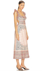 The Zimmermann Matchmaker frilled midi dress is a stunning choice for various occasions. Made from linen, this multicoloured dress features a flattering midi length and beautiful frilled details. Featuring a square frilled neckline and frill straps, finished with a cutaway back and self-tie closure. She has a square neckline with frill detail, boning at bodice side seams, cutaway back with self-tie closure and an invisible zip closure at centre back. Perfect for any occasion, this dress combines style and sophistication effortlessly.