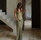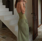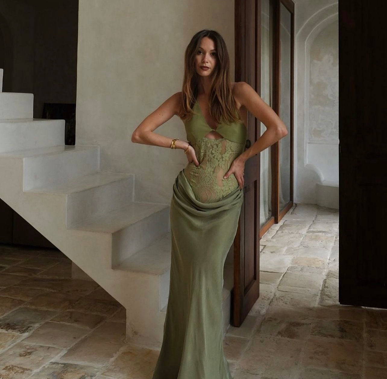 v neck lineIntricate built in lace bodysuitSlip on styleCupro, bias cut skirt w/ cowl featuringZipper in side stream