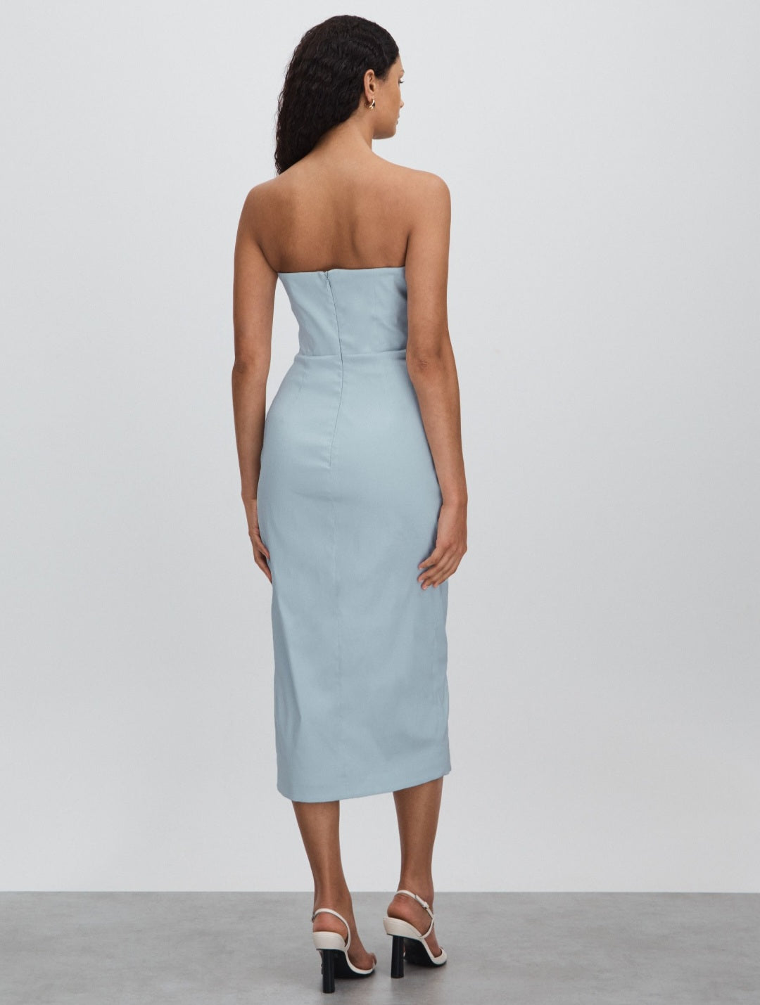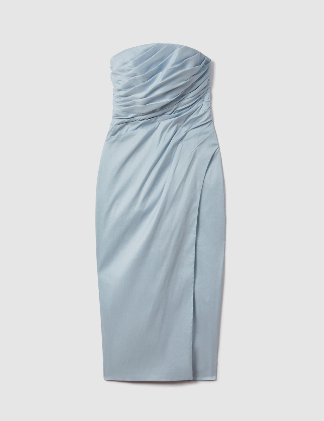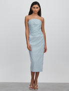 Designed to define shape & imbue elegance. The Mira Dress features a strapless, fitted bustier complete with internal boning for additional structure falling to a relaxed slim line mid-length silhouette. The Mira features intentional draping to flatter the female form and replicate effortless movement across the silhouette. This silhouette is fasted by an invisible zip closure and features a side leg split for a balanced shape.