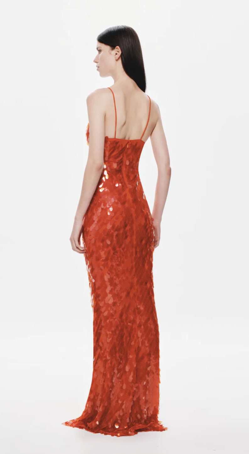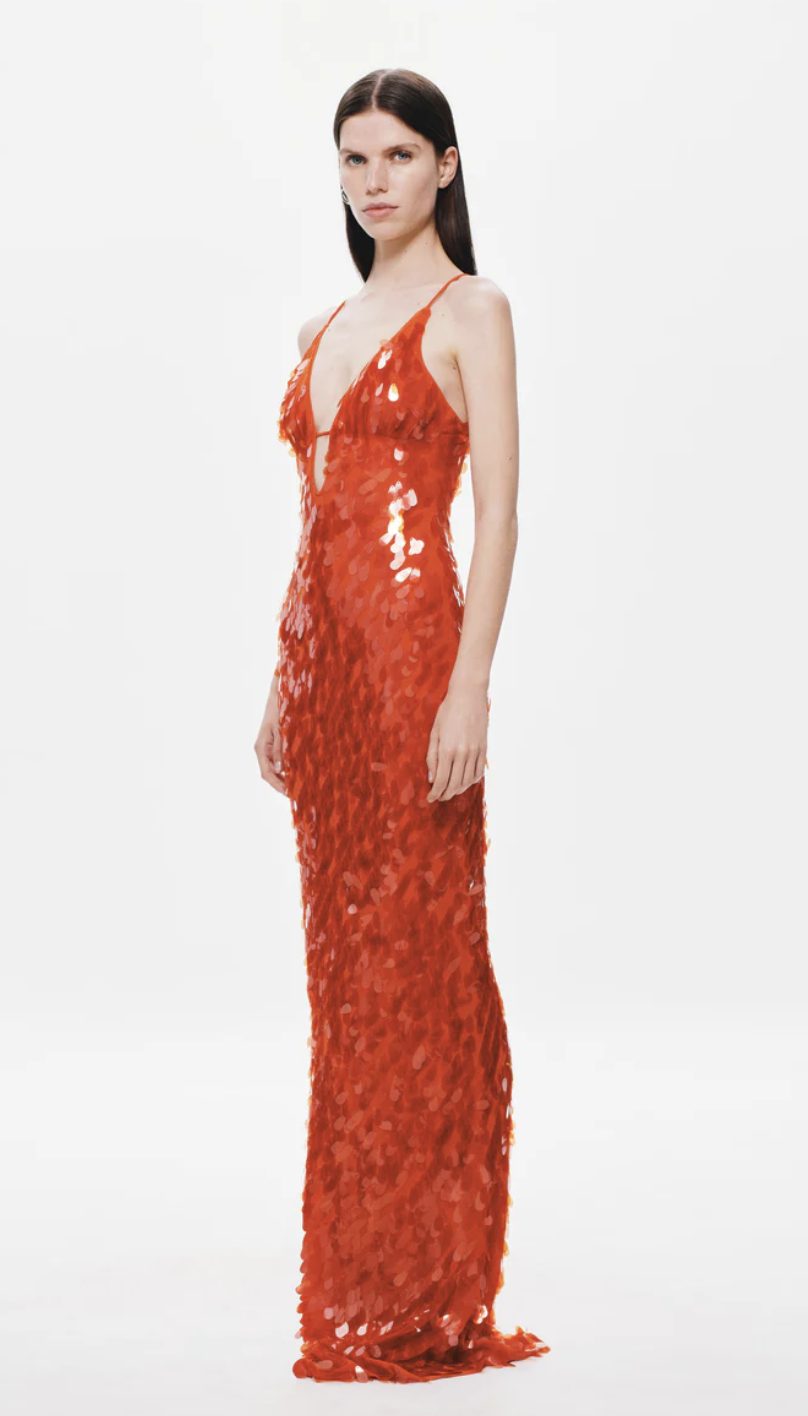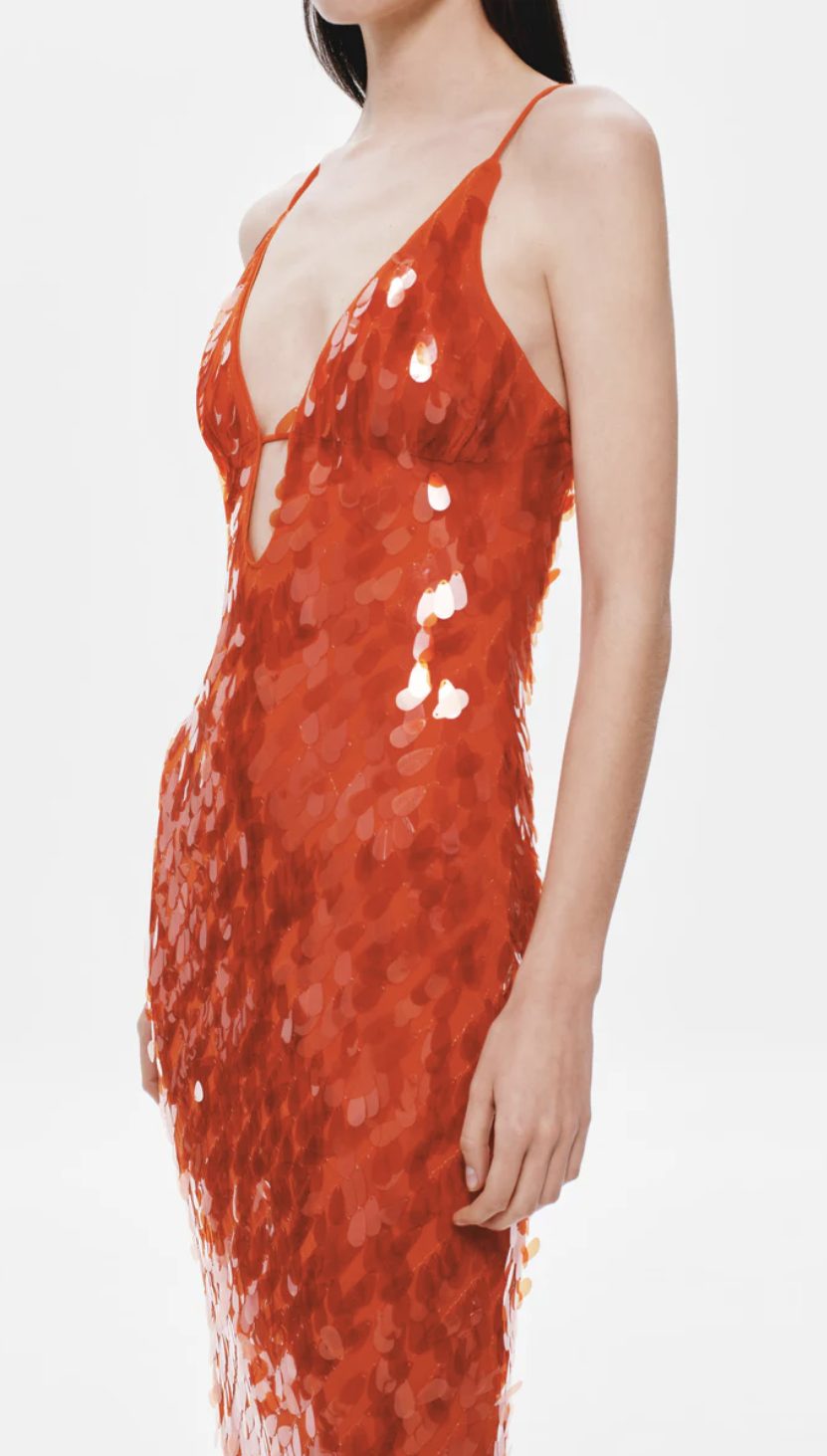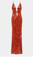 The Sapphire Sequin Maxi Dress in Red, event-dressing redefined.She is elegant with her maxi silhouette, yet has a fun sensibility through her bold colour. Each sequin catches the light- emulating the soft movements of water. Sapphire is also daring with her plunging neckline and low-back. Style her with a strappy heeled sandal to finish the look.