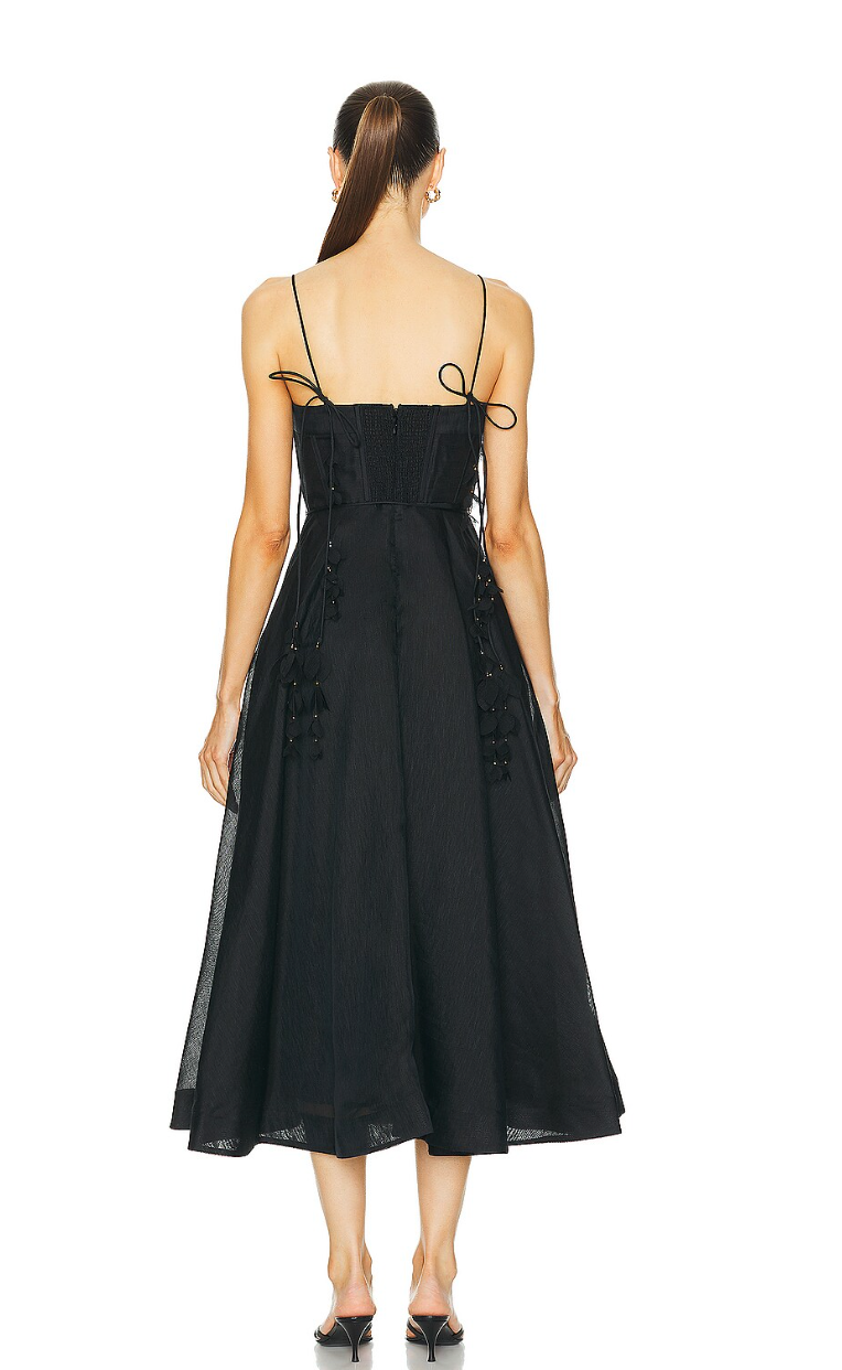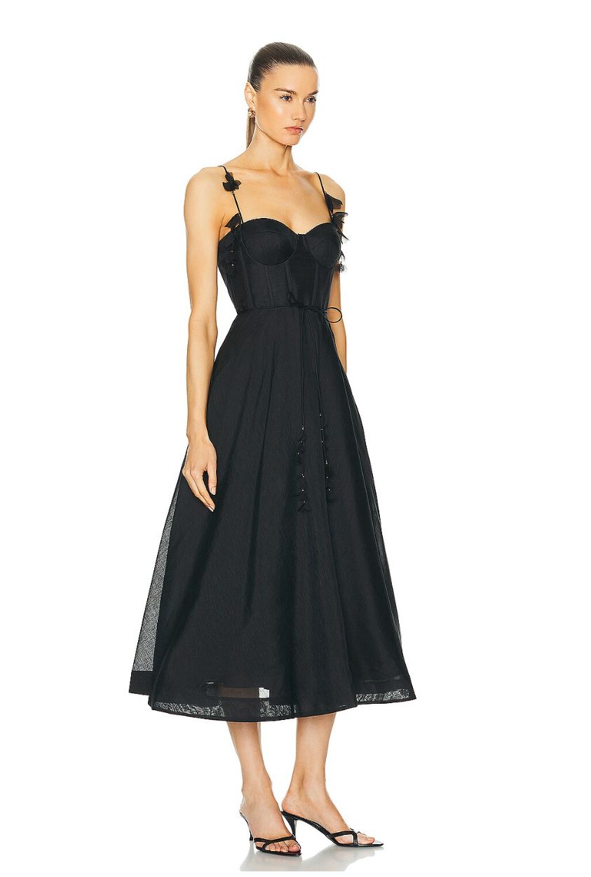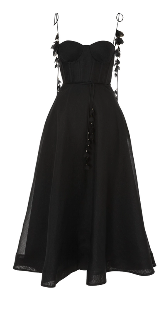 The Natura Midi Corset Dress in Black by Zimmermann is a silk linen organza midi dress featuring a fitted corset bodice with a full skirt, flower rouleau trims on shoulder straps and on the self tie belt, with chain stitch belt loops finished with shirred elastic across the back and boning on bodice. She has side seam pockets and an invisible zip at centre back.Classy and chic, this elegant gown will be perfect for any occasion.Best fit AU 12 to a small busted 14.