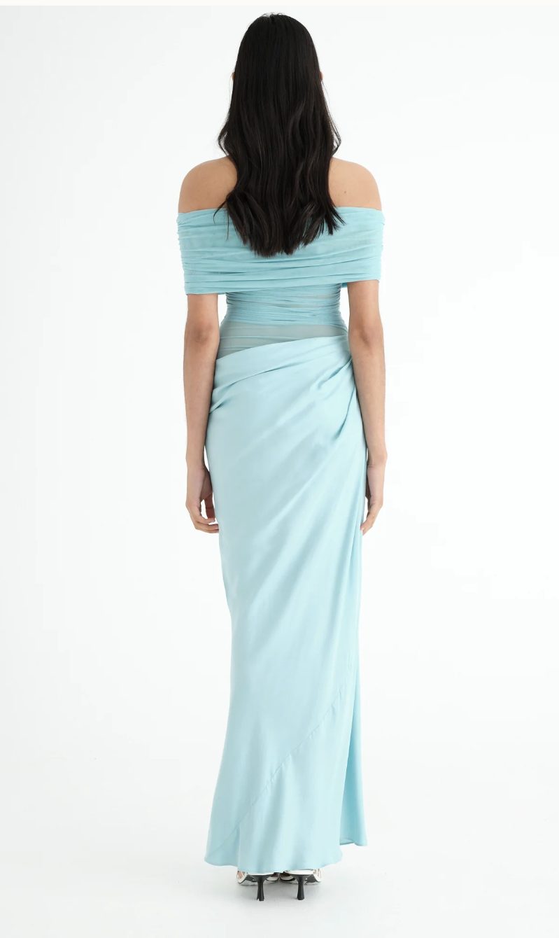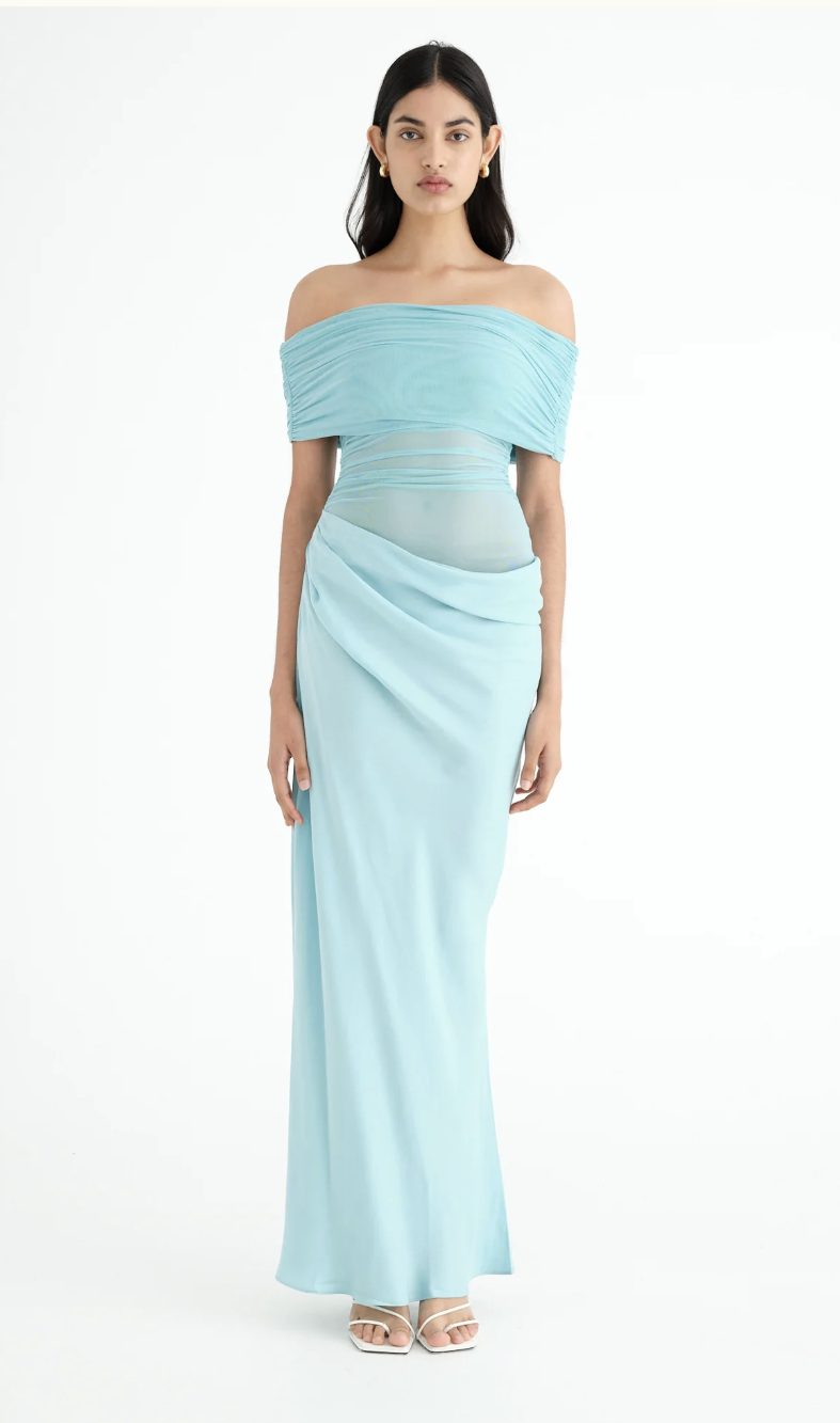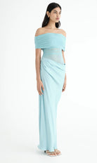The popular and elegant Nico  Maxi Dress features an off-shoulder design and  a flattering cowl on the left side waist. The overlapping skirt and mesh bodice creates depth, with the option to show more skin on the wearer's left hand side waist. Designed to skim the body, BENNI have created this stunning maxi in this brilliant Aquamarine colour.
