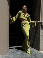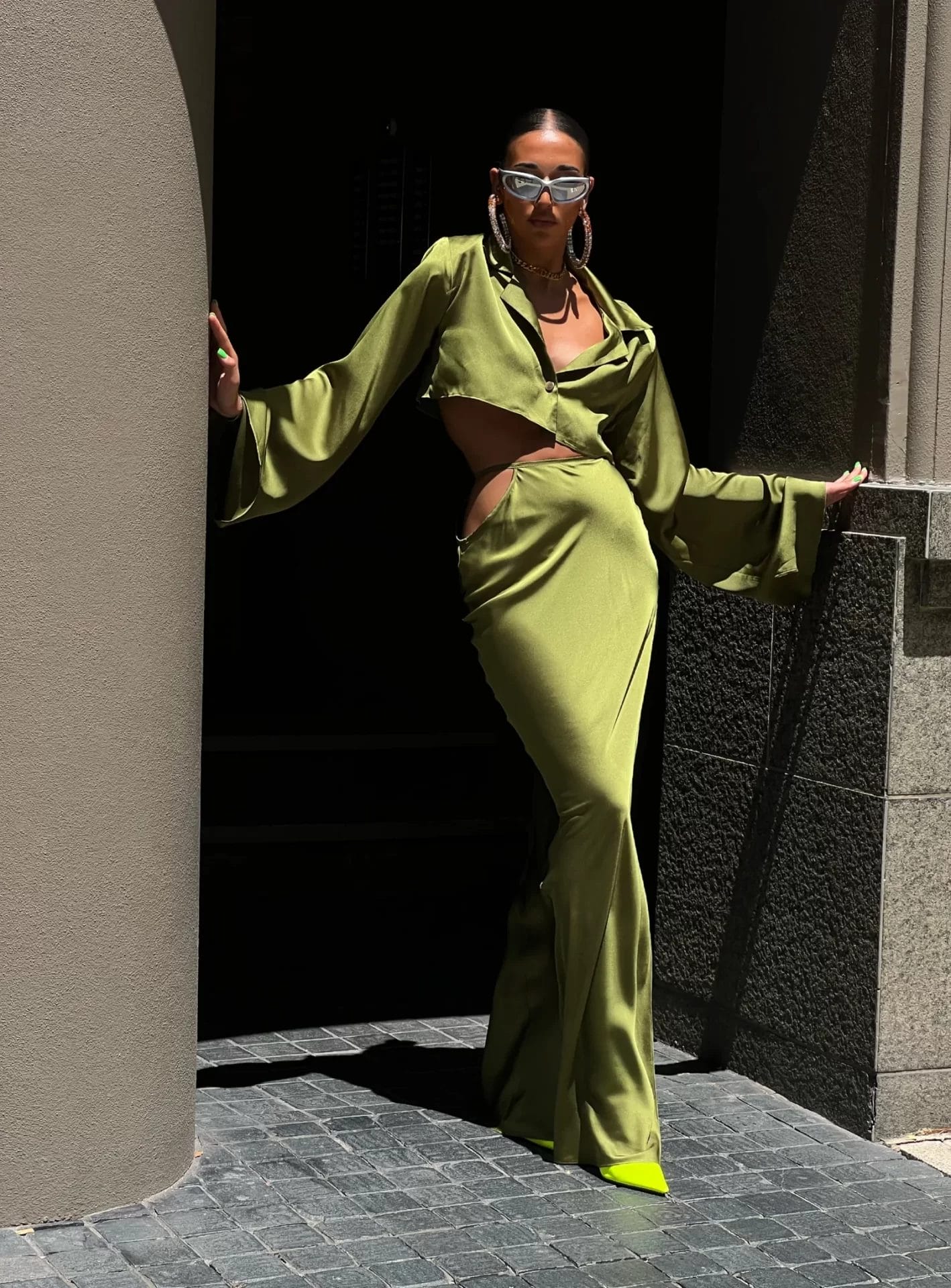 The Nilo 5.0 blouse is a cropped statement piece. The Nilo 4.0 Skirt is a statement Skirt with a high side slit with a waist cut out and a side zip