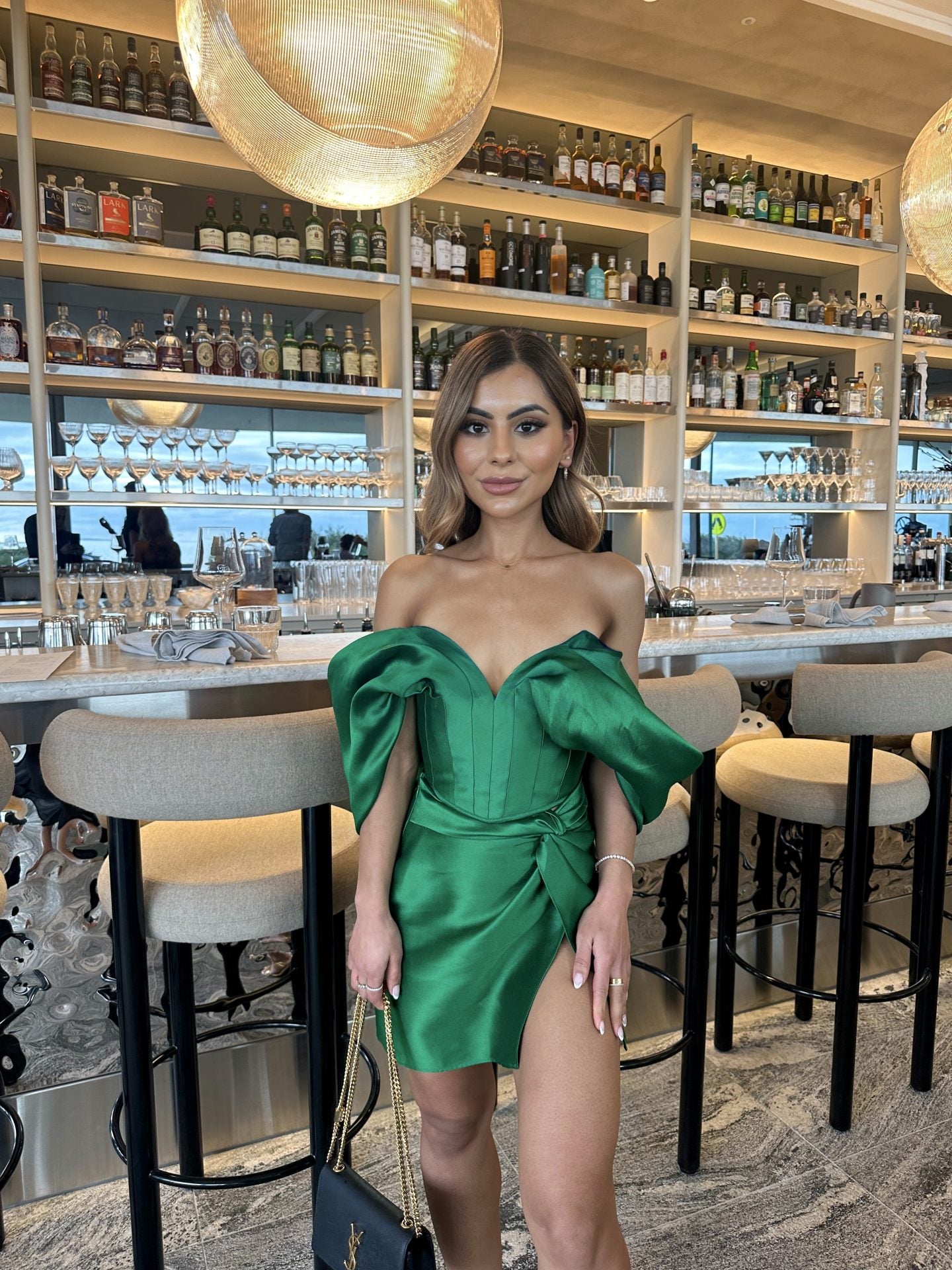 The Nina Corset is a heavily boned structure with back zip closure. This piece is designed to snatch your waistline and lift your bust with the sweetheart front structure. The dramatic sleeves is held up with precise tailoring, creating a dramatic structure to the collarbone.The Nina Tulum Mini Skirt is detailed with a slit and twist like design on one side. Zip closure allowing for easy wear.