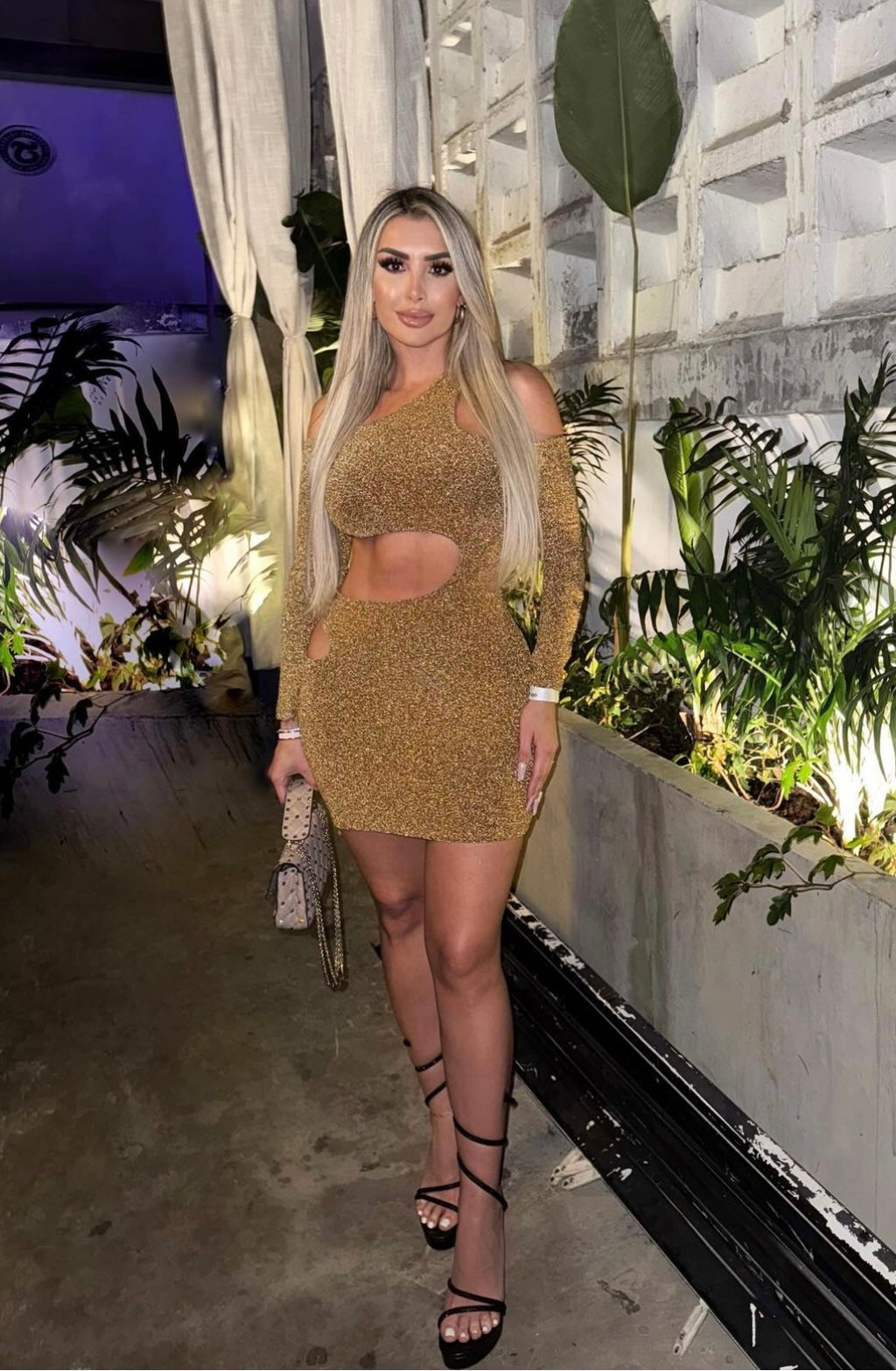 True to sizeHidden side zipper closureOne shoulder styling with cut-outsMetallic threading throughout