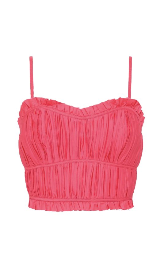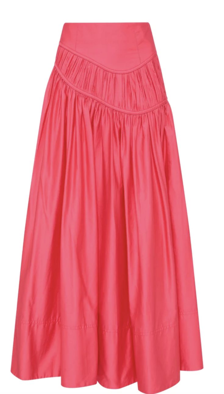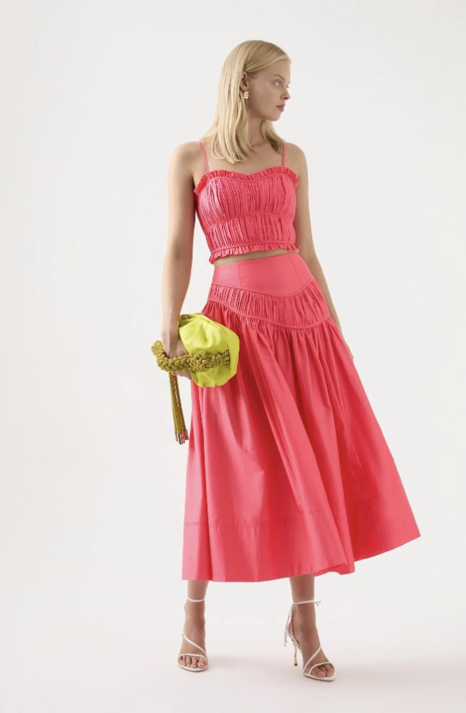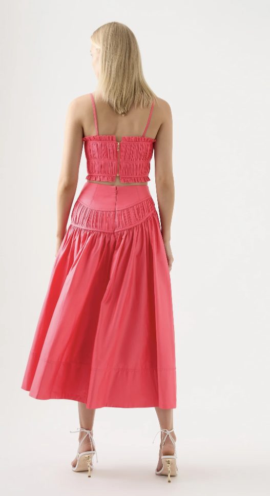 Aje has created such a versatile set here with a gorgeous coral colouring.There are two skirt options which match perfectly with the Pepper Ruched Crop Bodice. Please let us know which of the skirts you would prefer.The Pepper Ruched Crop Bodice features ruching, binding and frills throughout and is finished with an invisible zip at the back and lined.The Calder Mini Skirt is a high waisted mini skirt consisting of ruched panels at waist and hem as well as featuring side seam pockets. An invisible zip is at the centre back and is also lined.Curve Midi Skirt in Rouge Pink is a high waisted midi skirt, fitted yoke with asymmetric ruched wave panel and side seam pockets. She too has an invisible zip at centre back and is lined.