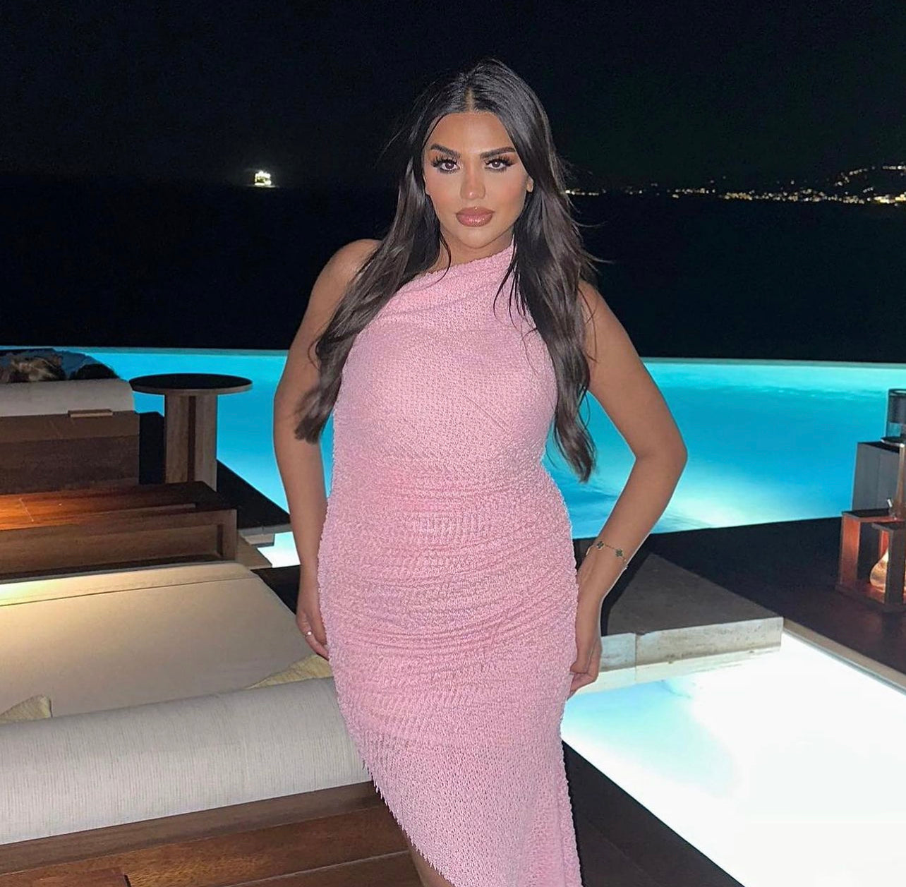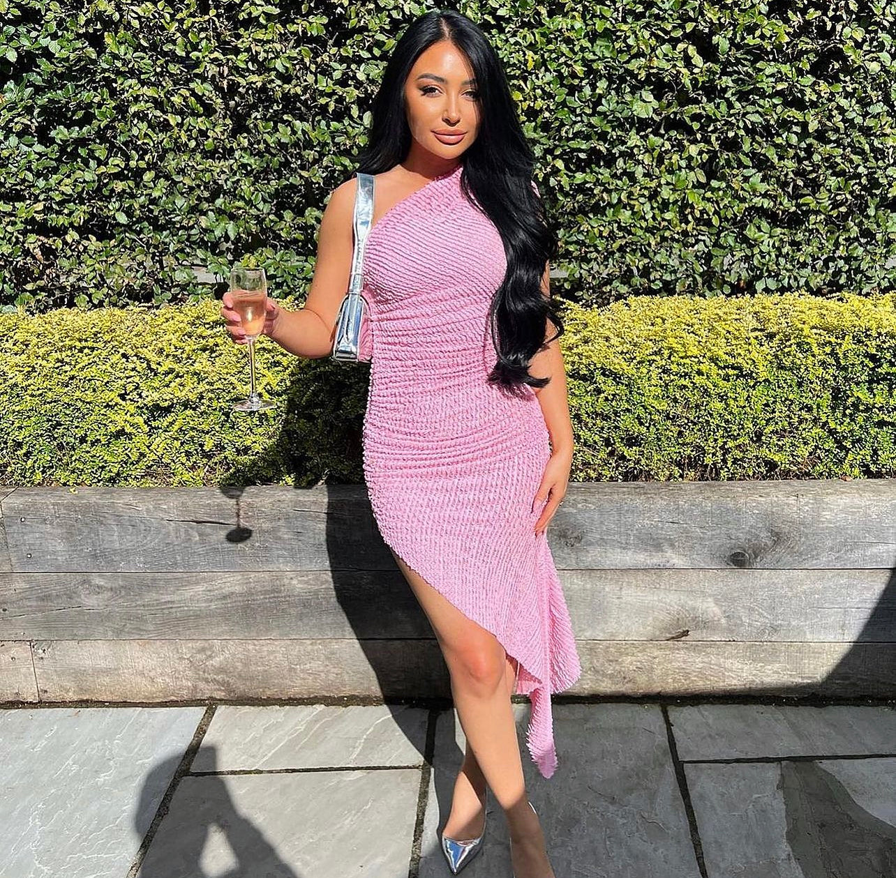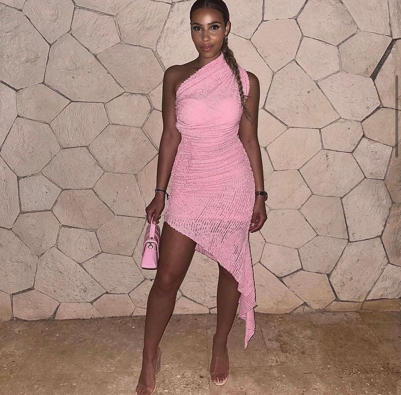 • size xs, can fit a 6-10Asymmetric dress in Piglet. Innovative, slinky material. Stretches, ruches and drapes across your contours. Unfinished edges for a deconstructed look.