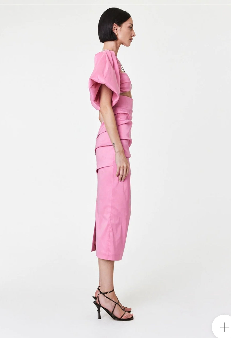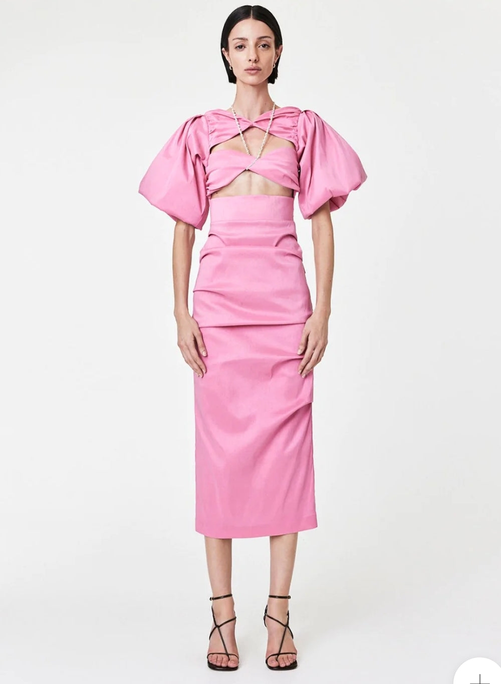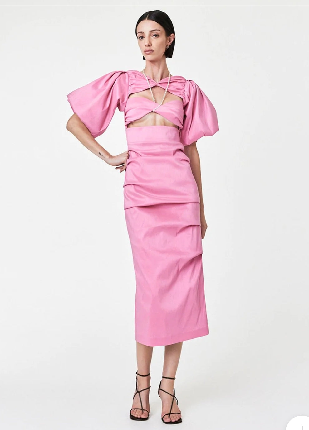 An eveningwear update, the Dahli Dress balances exaggerated sleeves with a form fitting silhouette, complete a self tie embellished strap. Falling to a mid length silhouette complete with bust cut outs and an elasticised back.Runs true to size. This garment has minimal coverage through the bust. It is best suited to cup sizes A-C but can fit D-DD as previously rented and tested! The necklace detailing on this piece is adjustable with a clasp closure.