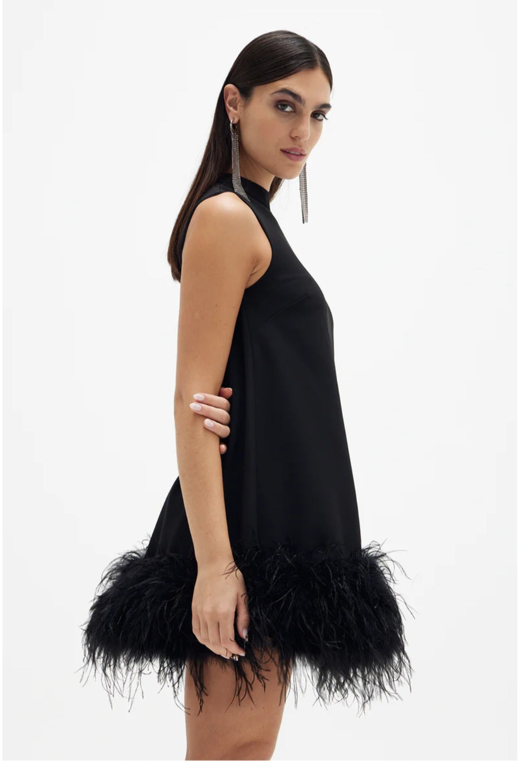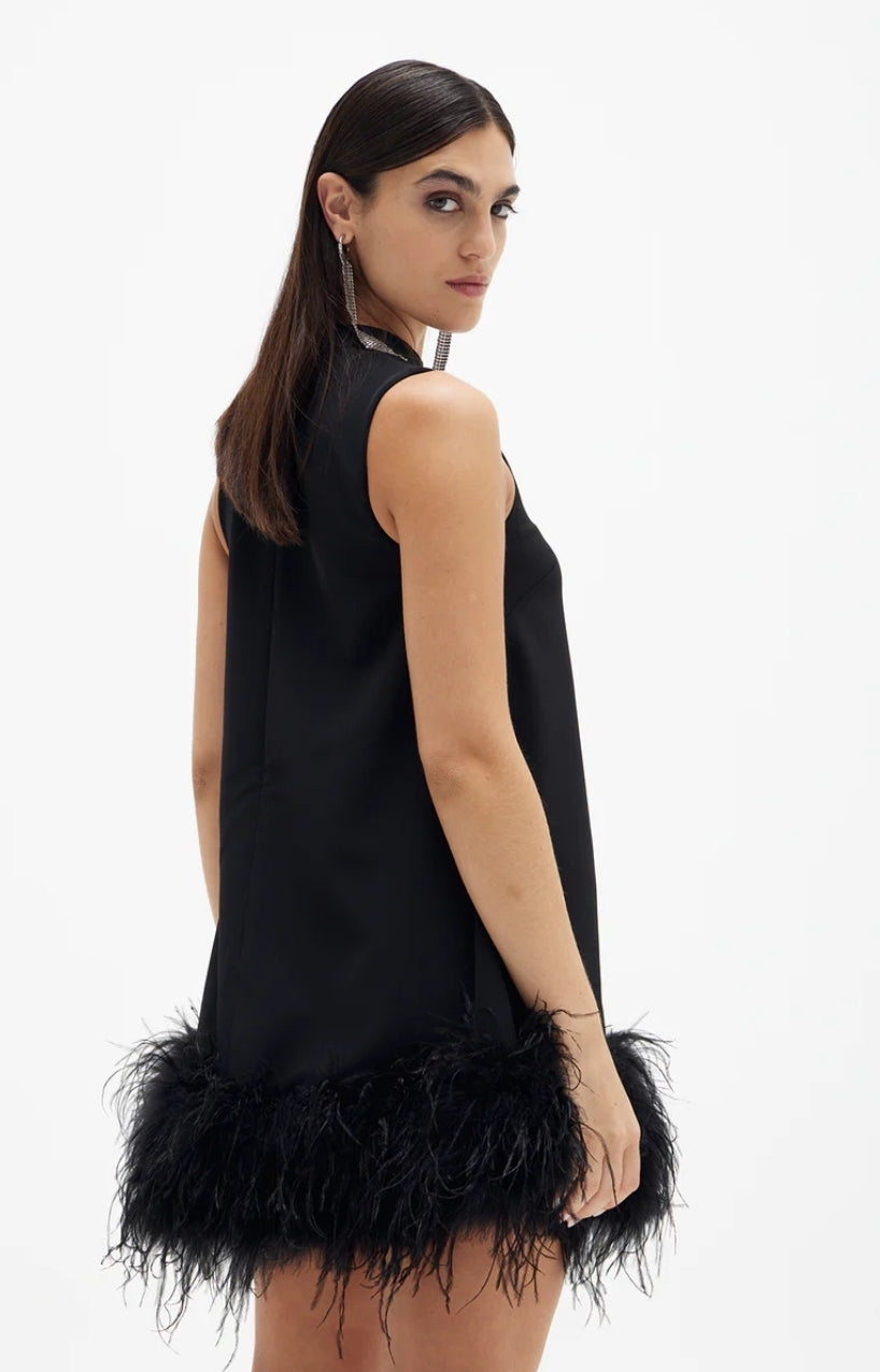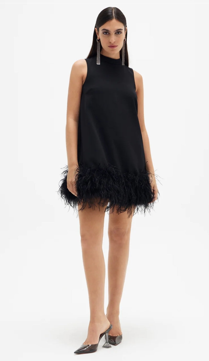 An update to the quintessential mini featuring a raised neckline and ostrich feather hemline cut to a flattering a-line silhouette. Made from stretch bonded crepe.Runs true to size.Fits close to the body, skims curves and doesn't cling.