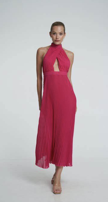 L’idee’s  glamorous the Renaissance Gown in Punch is a silhouette of eternal elegance.Designed to self-tie in a bow at the back of the neck, this elegant midi-length silhouette is open back and sits fitted on the waist. Featuring signature ribbed pleating on the torso that contrasts with a structured and slightly voluminous pleated A-line skirt that was made to be twirled.