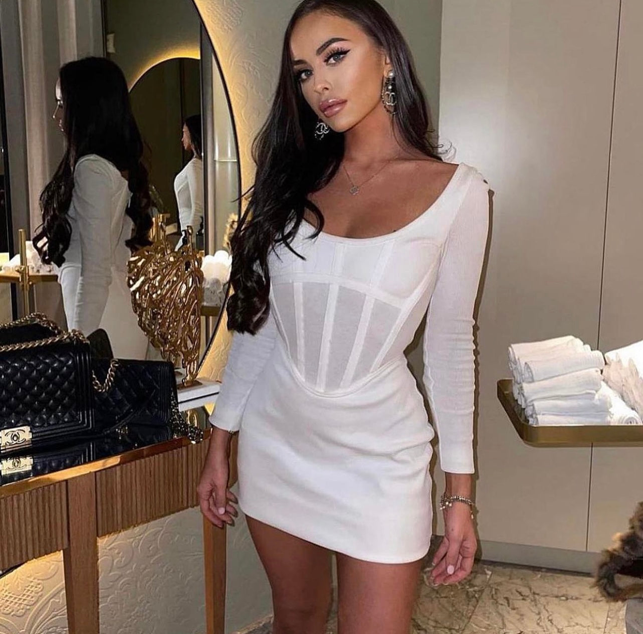 Long sleeve mini dress featuring a corset-style bodice. Flattering deep scoop neck collar at front and back. Metal zip closure. Exposed boning detailing throughout. Cut for a close fit from a soft rib jersey fabrication.