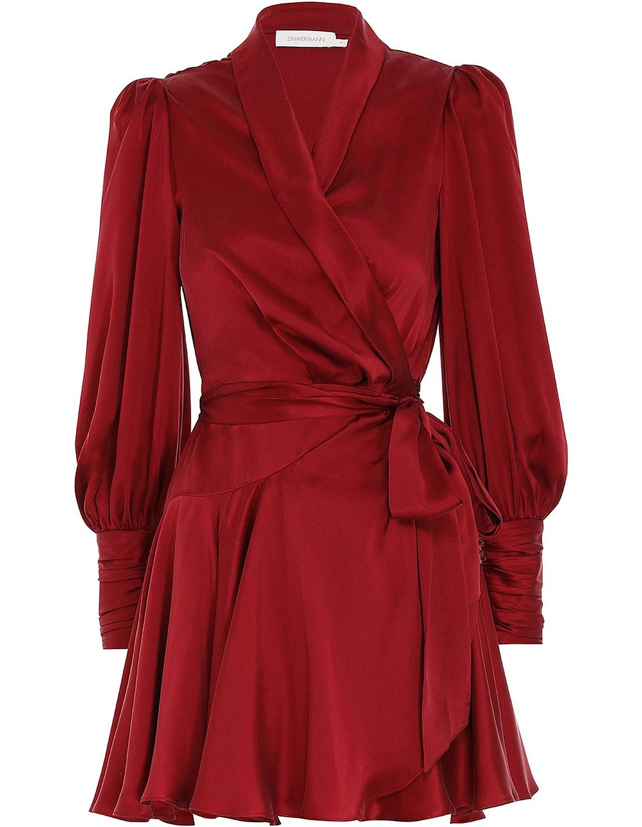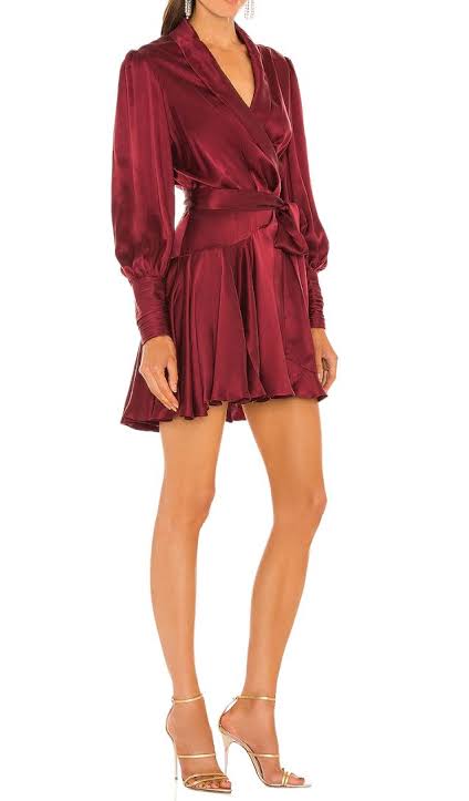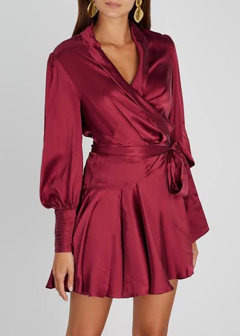 Wraparound design, longe sleeved, ties at the waist for an adjustable fit, silk-satin Ties at side.