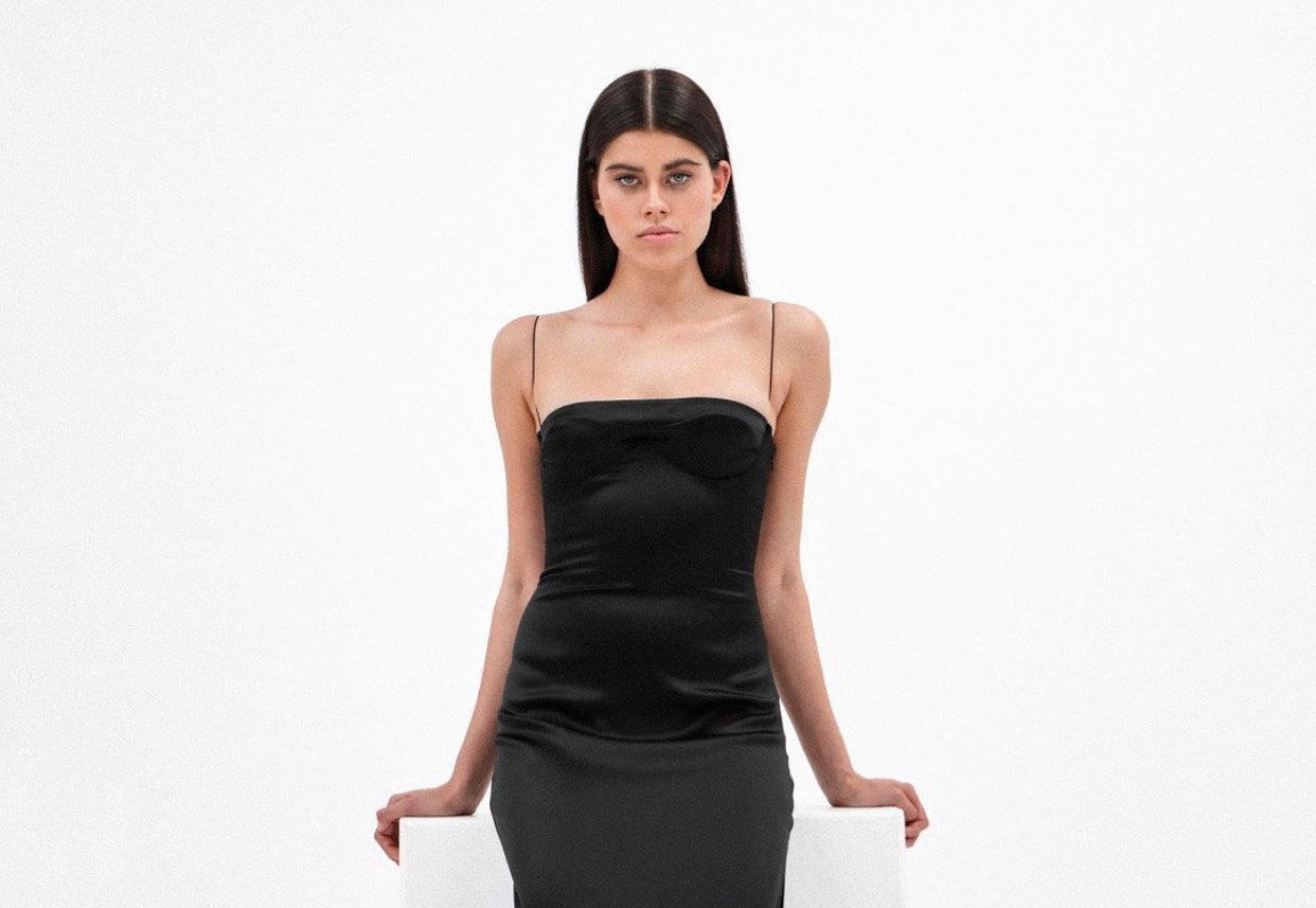 A long silk gown featuring bust cups, an underwire feature and side split.