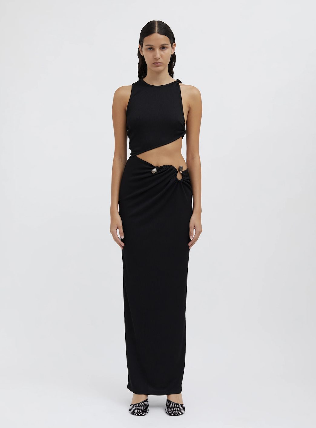 96% Polyester 4% Spandex, 100% Zinc Alloy with 100% Natural StoneHand crafted Black Agate and Charcoal Agate Natural StoneLuxe Compact RibFull length silhouetteSignature Christopher Esber cut out detailingSlim fitTrue to size
