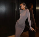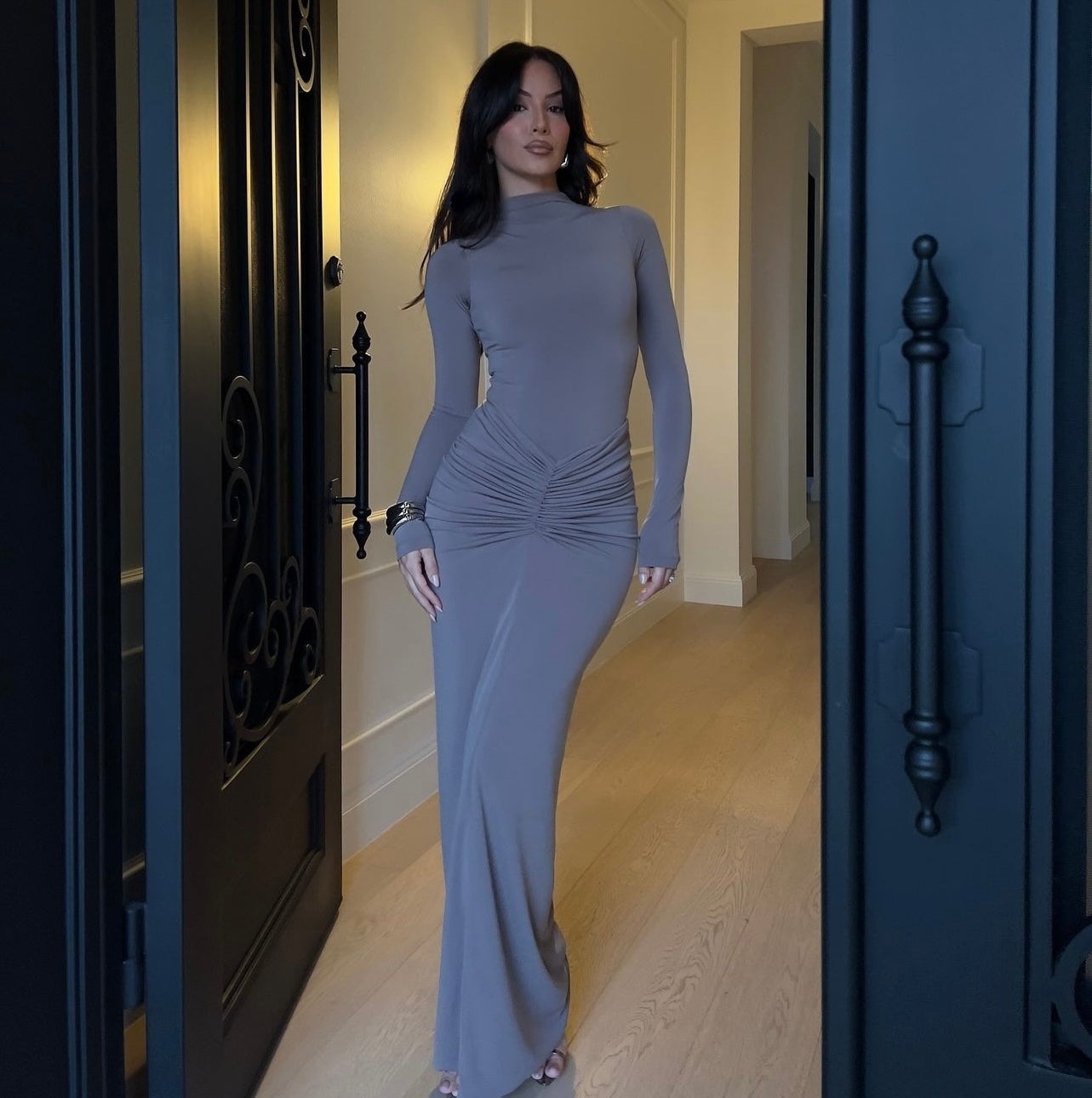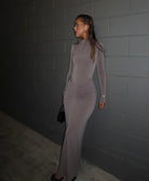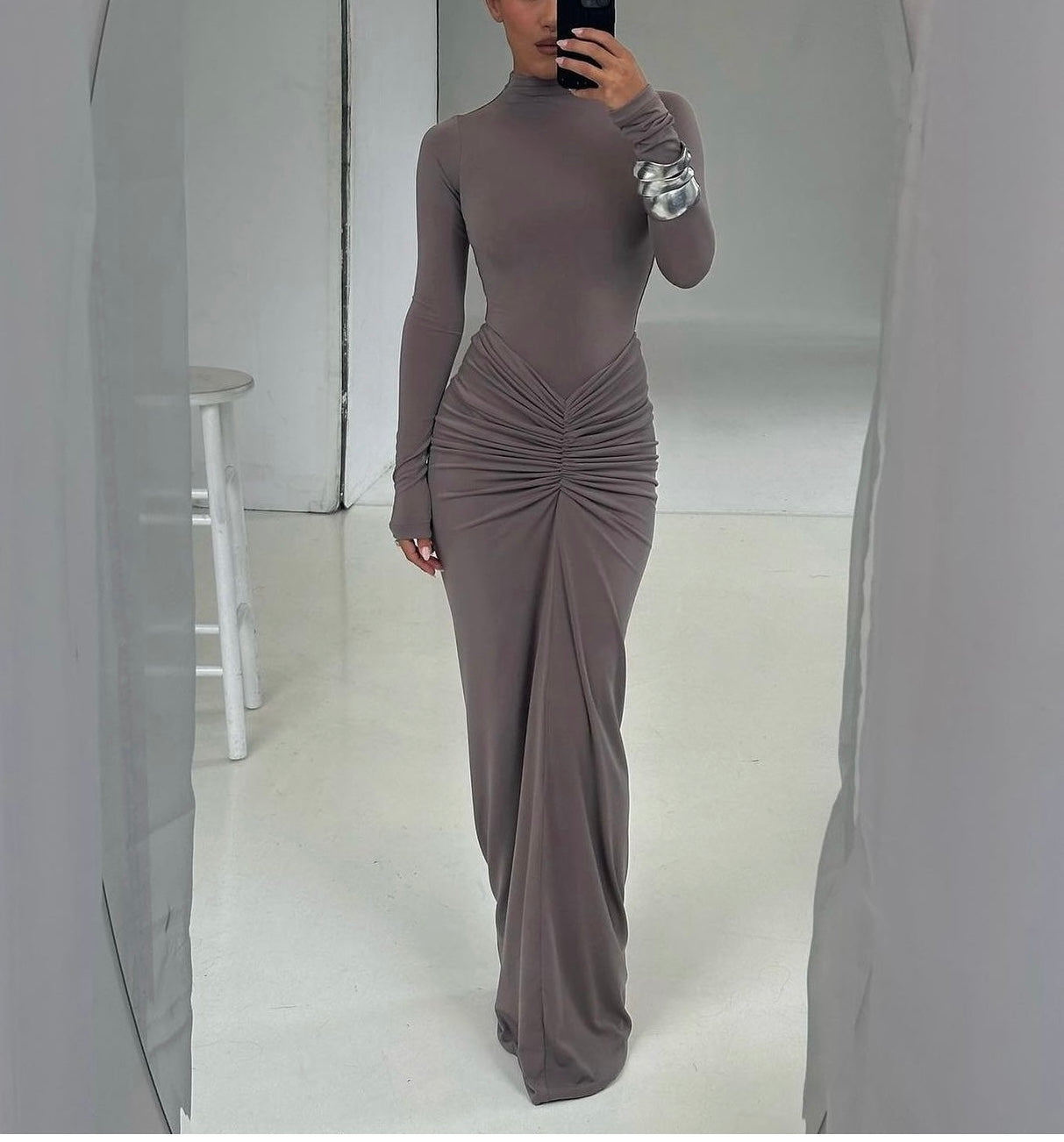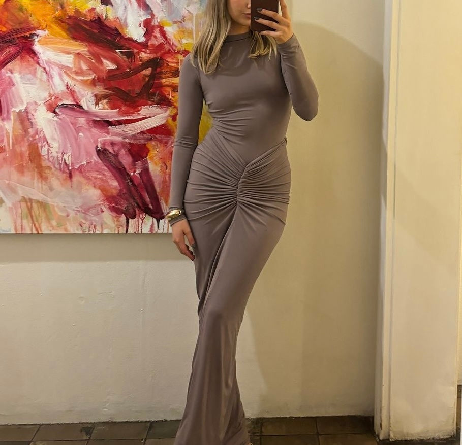 Sizes S and M availableStretch jersey , not double linedZip upfloor length silhouette skirtRuch gather detailing