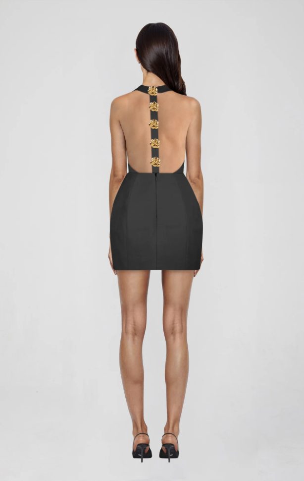 The Tiffany Dress is a fully lined, statement cocktail style dress. Featuring a mini length hem, t-back detail and hand-stitched floral metal hardware. This pretty little black dress has an elegance about her that will enhance your already princess like status anywhere you go!Main: 75% Polyester, 25% Rayon