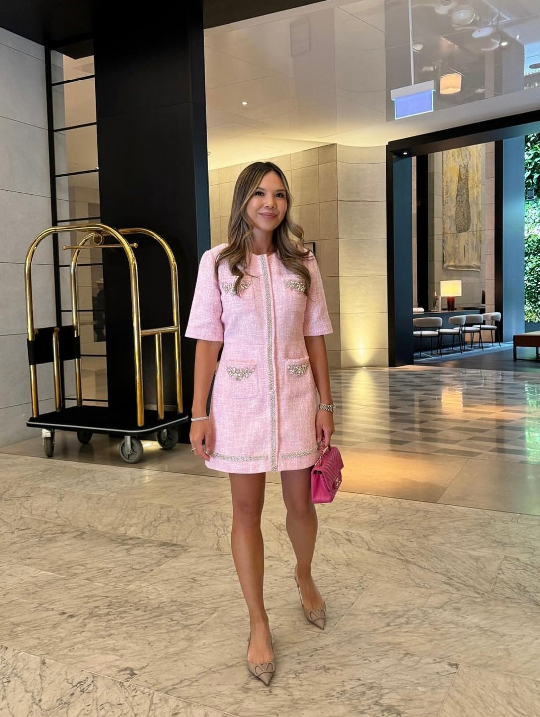 Trompe l’oeil tweed playsuitRhinestone jewelry braids4 patch pocketsTrue to size.