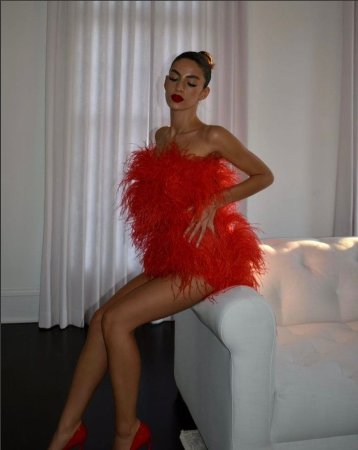 The Vanna Dress embodies maximalism with its extravagant feathered fabric, off-shoulder sleeves & bright red hue. Suspended from dainty straps, this mini dress is so playful