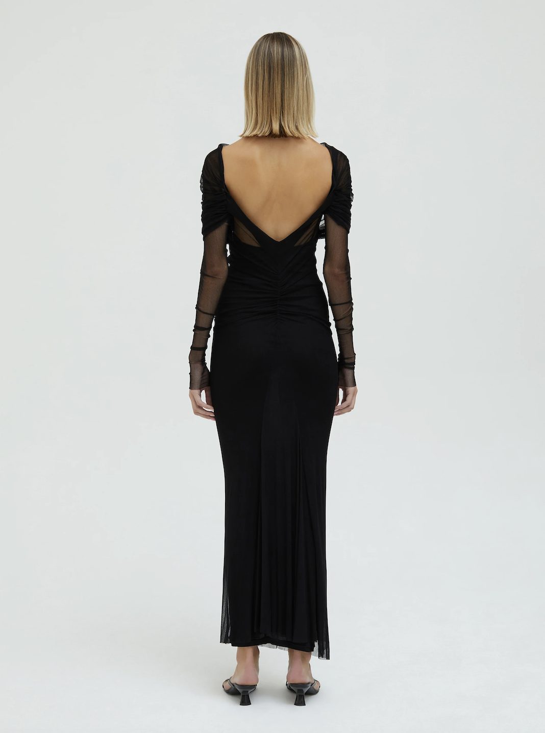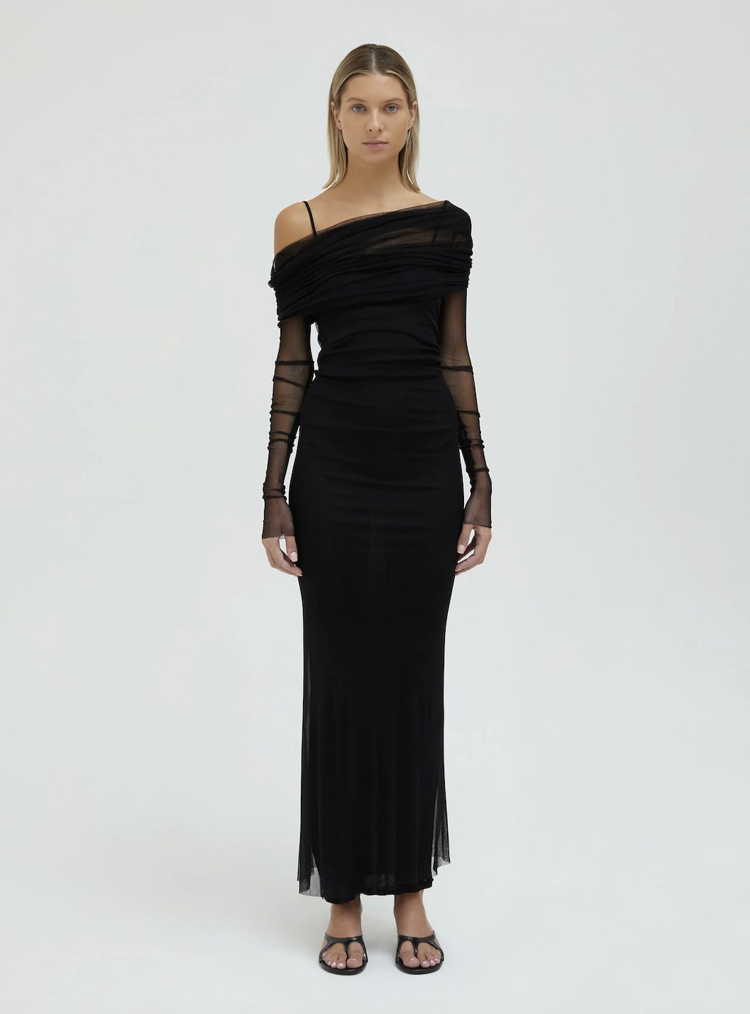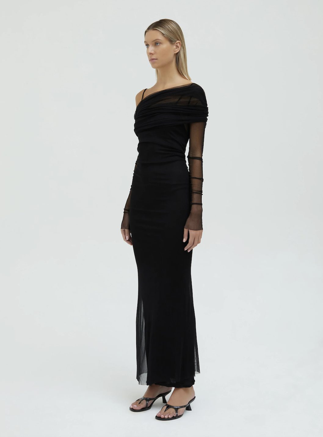 100% SilkSheer stretch fabricMulti wearSlip dress includedOff the shoulder silhouetteFull length hemTrue to size