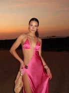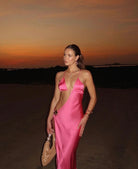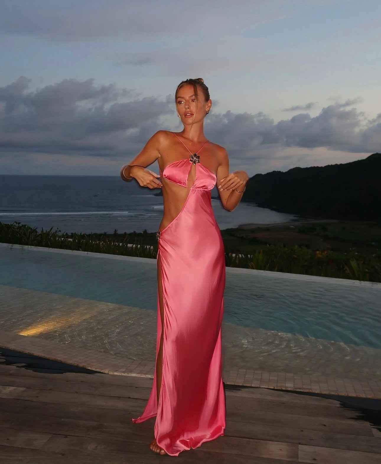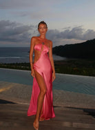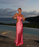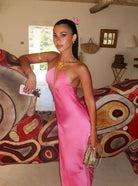 The 'it' dress of the season with show-stopping cut-outs and asymmetric backless design.Turn heads in Barbie pink, a celebration of femininity and color of the moment.Removeable, custom Cin Cin flower hardwareCustom Cin Cin embossed bead hardware on strapsSlit on right side seams
