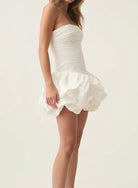 Size XS (Suitable for a-d cup)* strapless dress* Straight neckline* Fitted, ruched bodice* Mini bubble hem skirt* External back zip* Lined