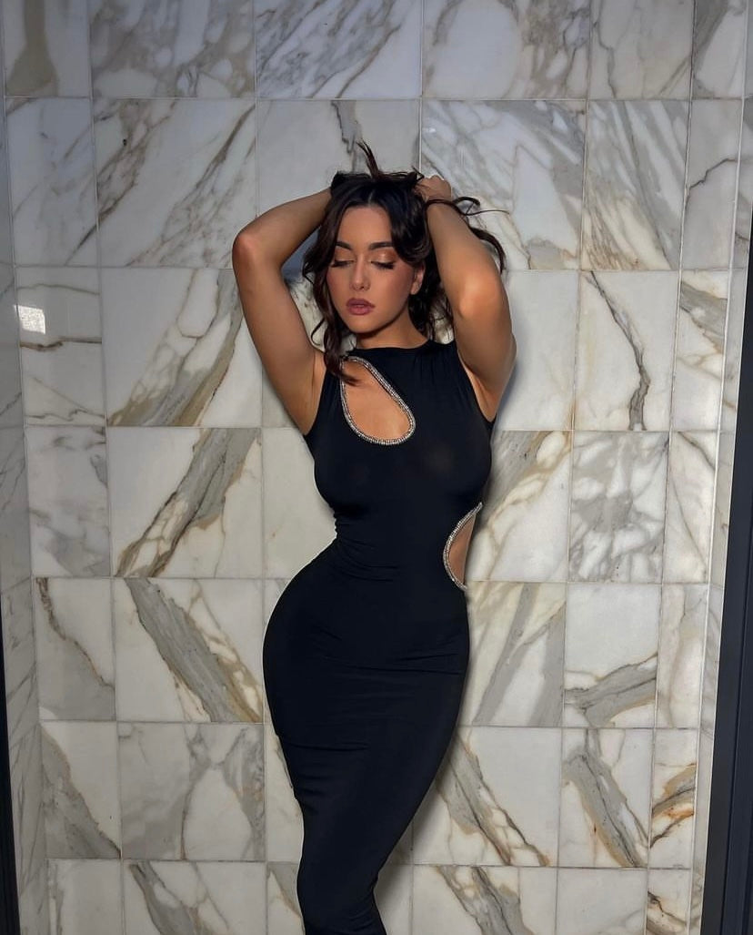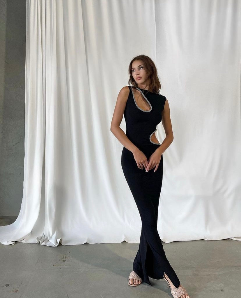 Vivia Dress in Black. Floor length dress with two cut outs and diamantés.NOTE: This dress is part of a personal collection and has been altered accordingly. The dress measures 125cm.Shipping cost includes a pre-paid return satchel.