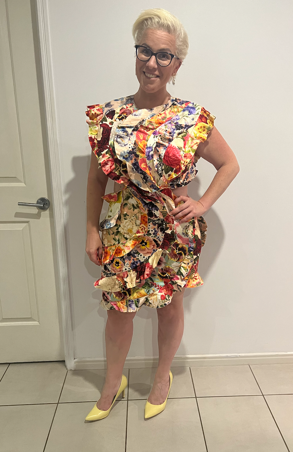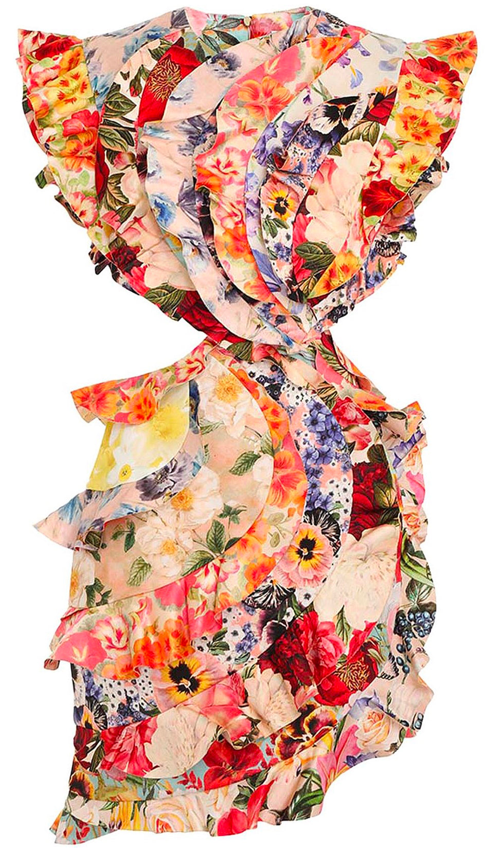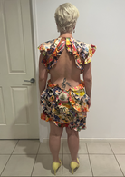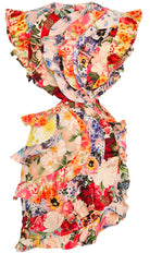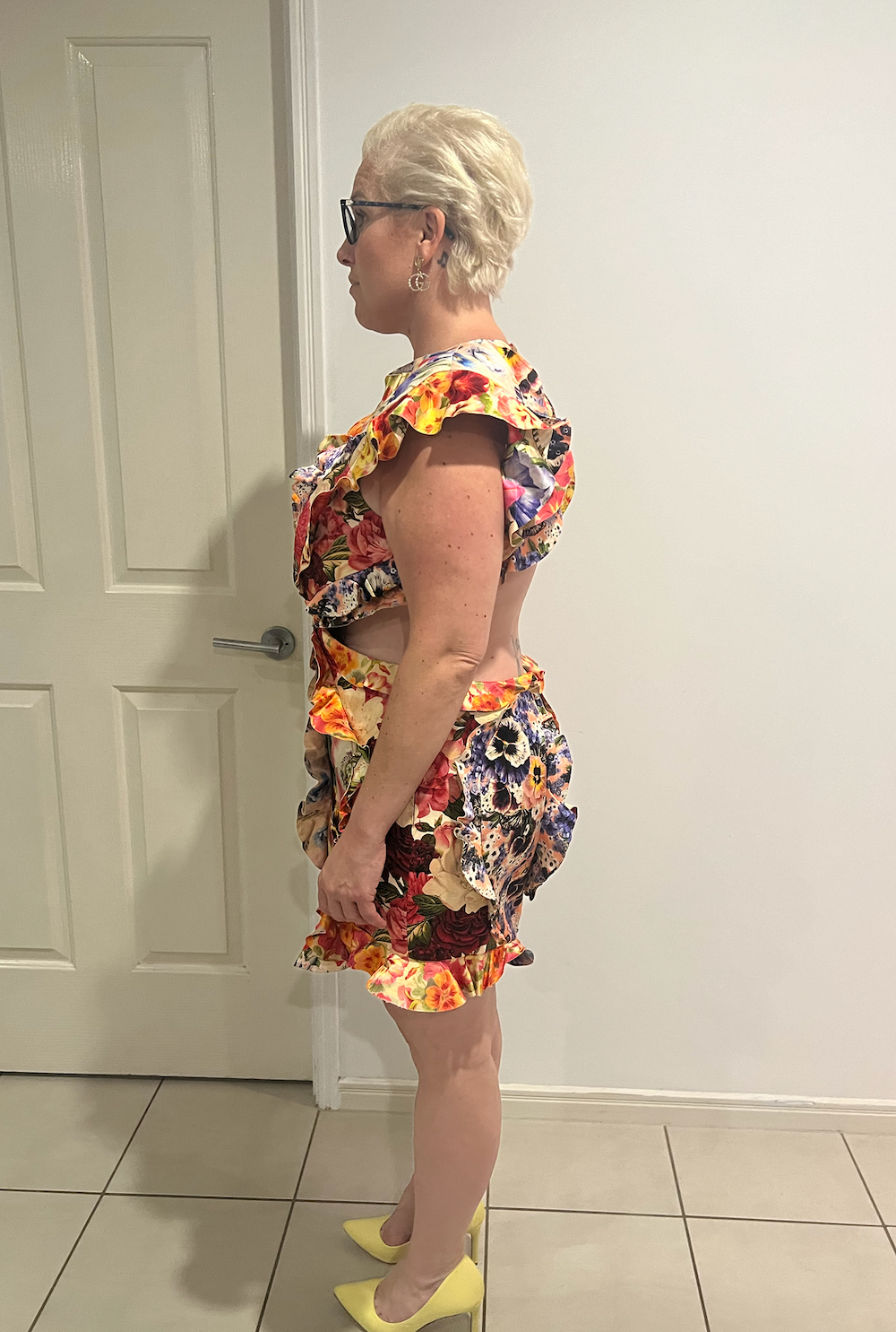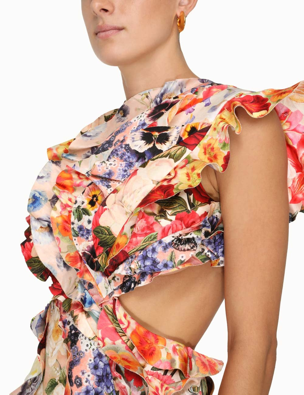 The Wonderland Frill Mini Dress in Spliced Multi Floral from Zimmermann. A silk linen mini dress featuring a cutaway waist and an asymmetric hem. Featuring a cutaway waist, spliced print frills throughout, shoulder pads and a button closure at the back. This uniquely stunning number screams enchanting and fun. Have a magical night in this Wonderland Frill Mini Dress. Zimmermann size 4, however, best fit is for a size 14 - small 16. A bustier size 12 with some booty works too ;)
