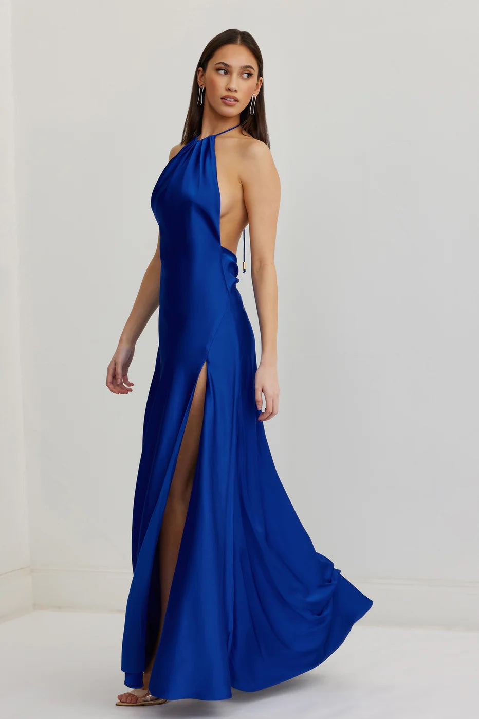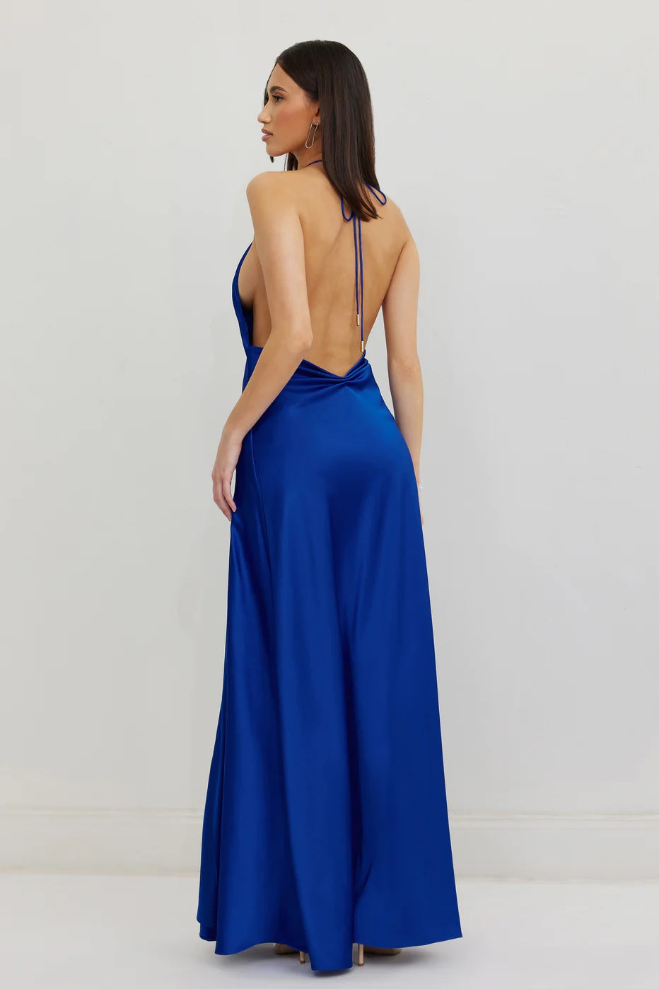 The Zuriel Dress showcases a high halter neckline and thin spaghetti straps that tie up at the back neck. The soft A-line shaped skirt flatters the body, and features two thigh high splits on both legs. The back waist features a small gather, flattering the lower back. The perfect soft, elegant and striking gown.Features:High halter neck, floor length gownTie up straps with gold togglesOpen back with small gather at lower backA-line shape skirt with double thigh high splitsFully lined