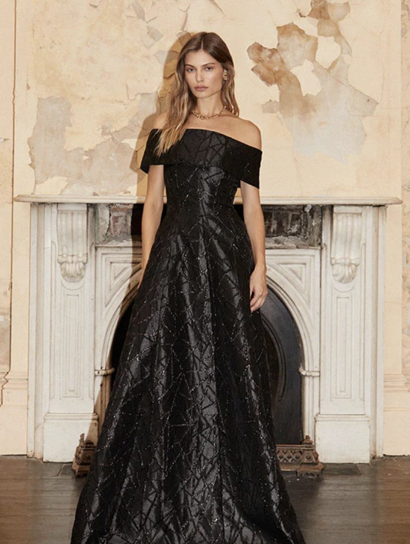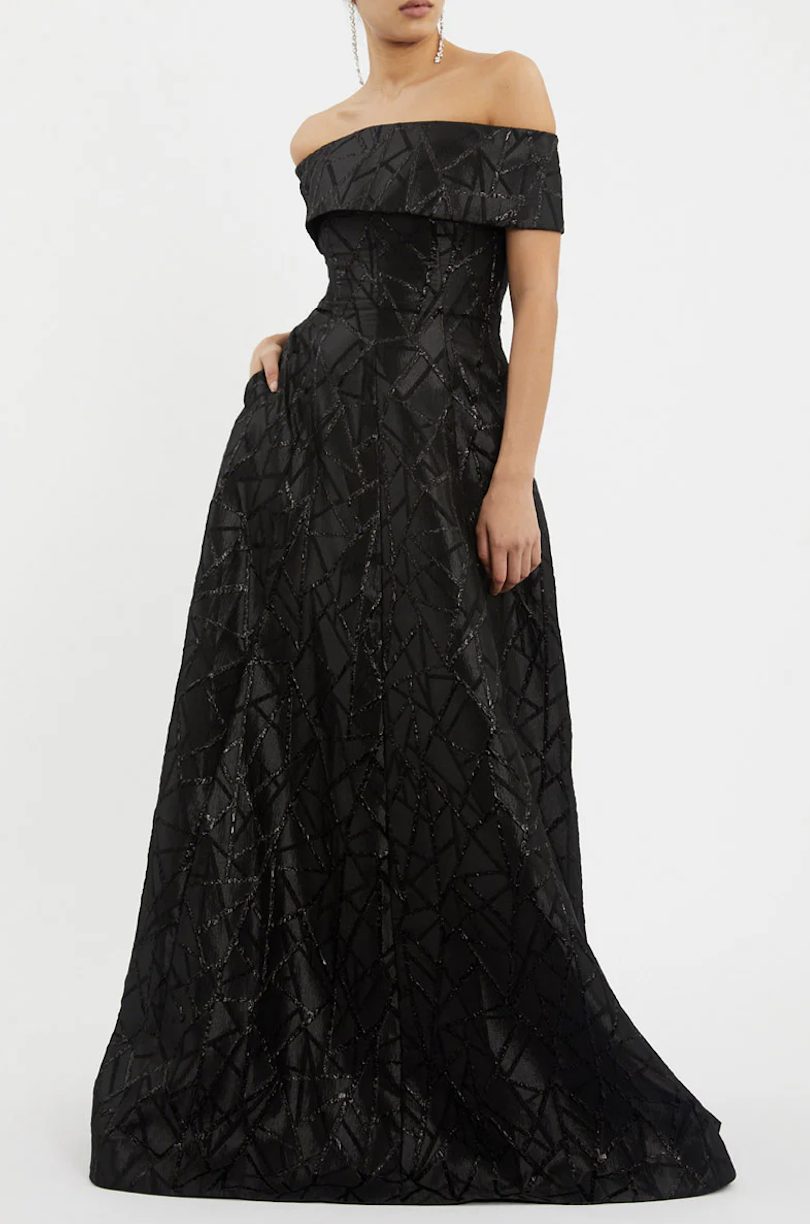 The Colette Off Shoulder Gown is one of our most elegant gowns to date. Designed in a heavy-weight brocade, this gown has a bonded bodice with internal grip tape at the neckline, side seam pockets, dome buttons and a zip fastening at the back. Designed as a fit-and-flare silhouette, wear yours with nothing but your favourite studs as an evening look. Dress is lined and fits true to size. Item fits true to size, take your normal size.