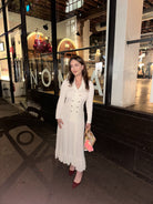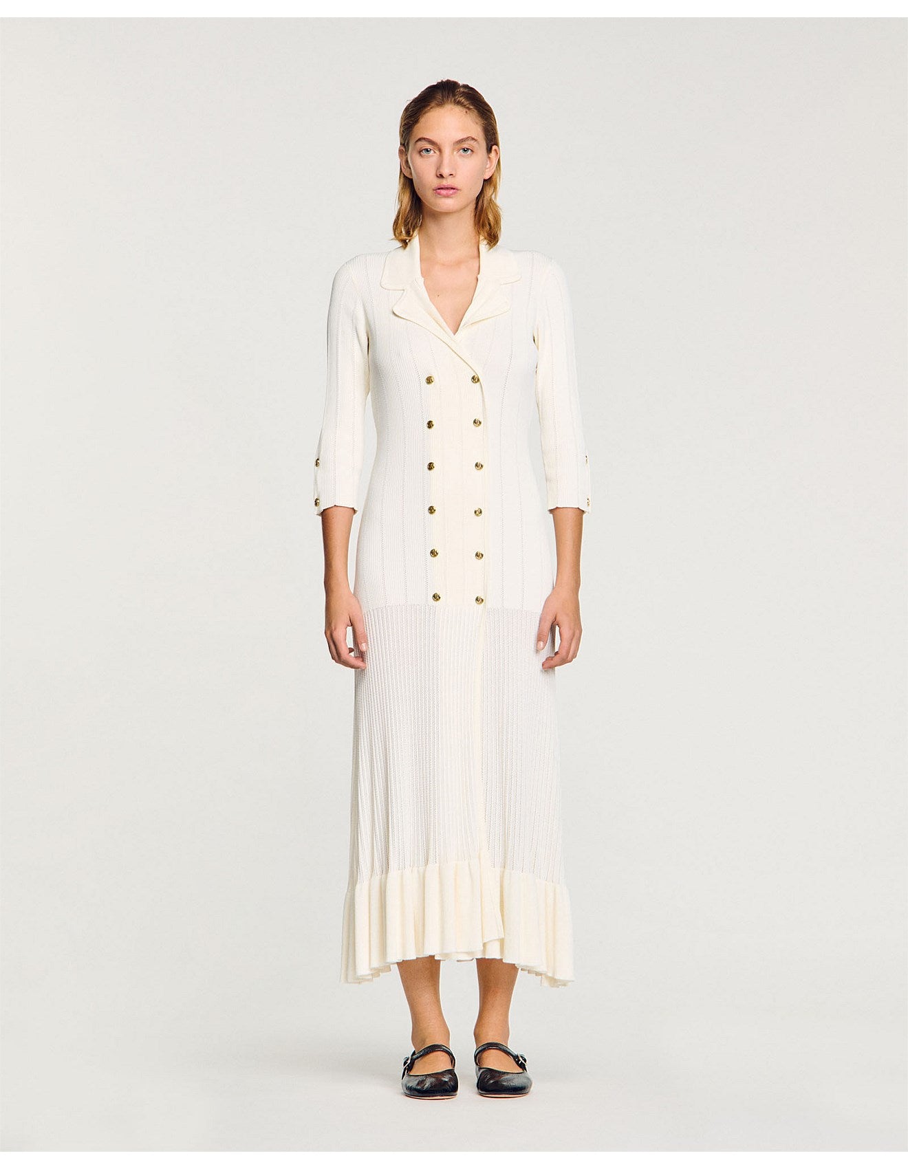 Pointelle knit maxi dress featuring a lapel collar, buttoned sleeves, double-breasted with decorative buttons and a flared skirt with ruffles on the hem.