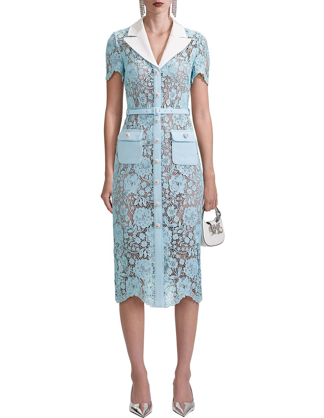 <p>Power tailoring meets our signature pastel blue lace in this polished midi dress. The charm lies in the details, with a face-framing contrast collar and sparkling diamanté buttons. The bodice falls to a sleek skirt with a scalloped hem for extra nuance. <br><br>Main Fabric: 98% Polyester 2% Polyamide Lining: 100%Polyester Belt: 100%Polyester Trim Fabric: 100% Polyester</p>