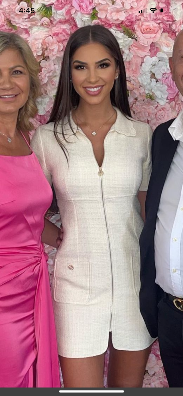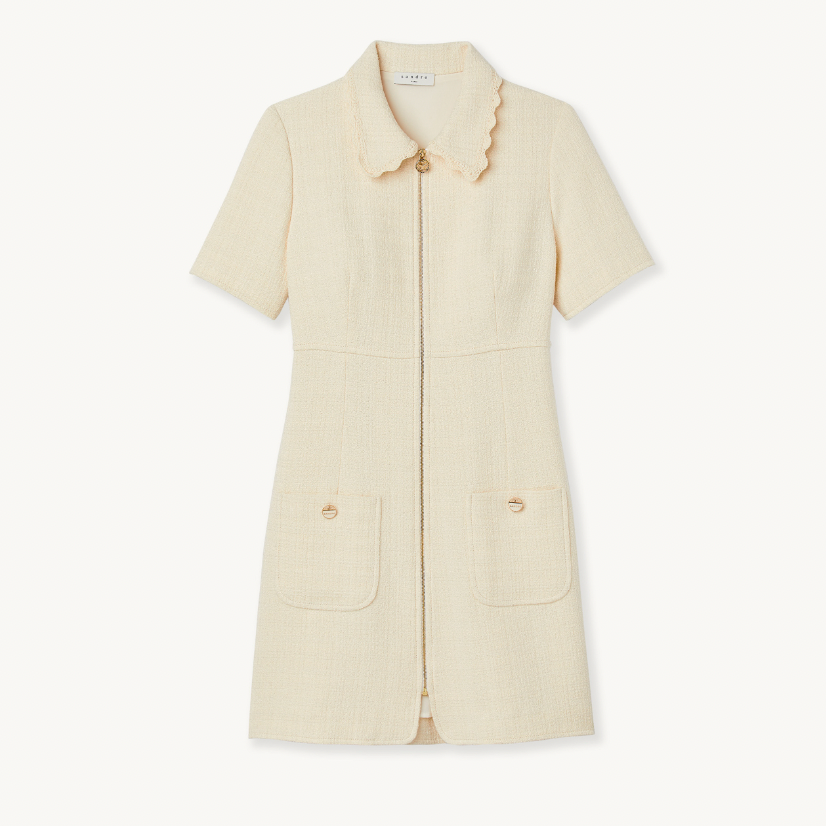 Short tweed zip dress with a scalloped neckline, short sleeves and textured buttons.