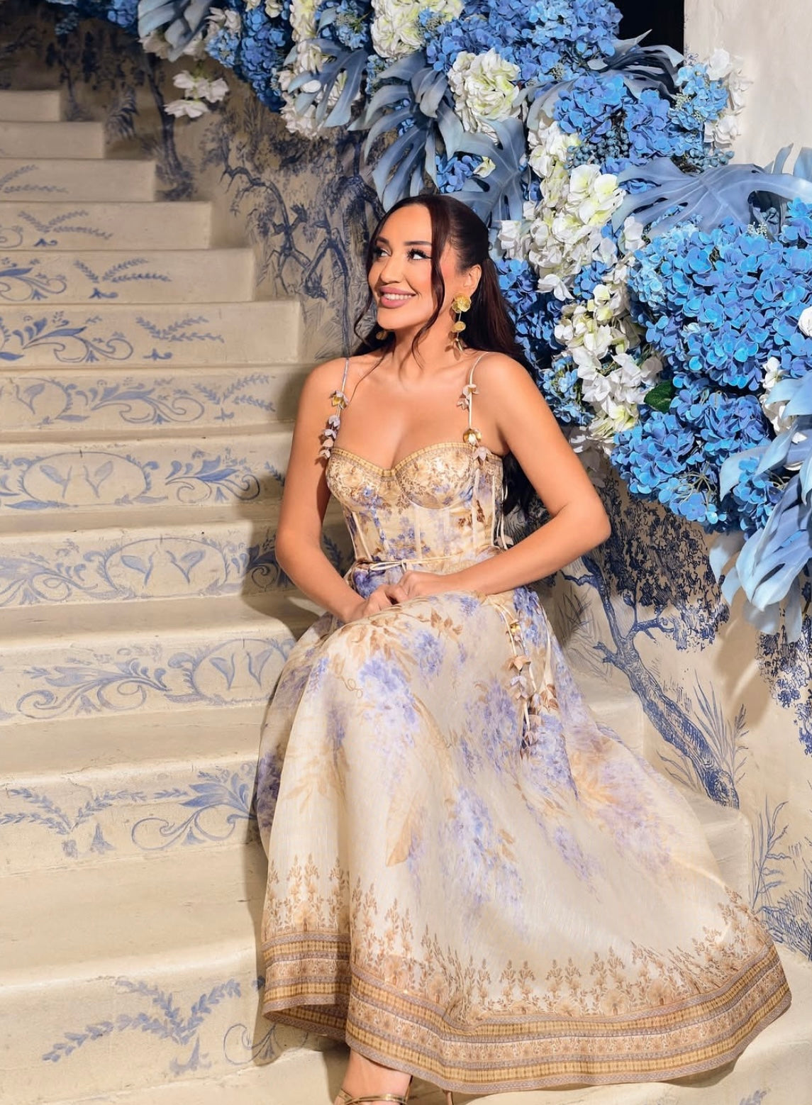 This divine piece from Zimmermann’s collection, Illuminate, is sure to take your breath away. She is a silk linen midi dress featuring a sweetheart neckline with flower details on the straps, finished with corset detailing, a shirred back, and a full flared skirt. Finish with matching shoes and accessories to elevate your look for your next event.