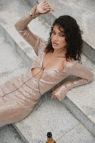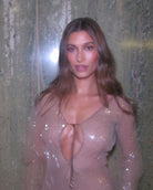 The Solaris Gown in Smoke Sequin features a keyhole cutout neckline with an adjustable drawstring closure in the front and back, offset with signature 16arlington extended sleeves. Cut in a slim fit with a slight stretch it is designed to be pulled over the head. This dress is fitted with a soft touch slip dress and has no itchy/scratch feel.