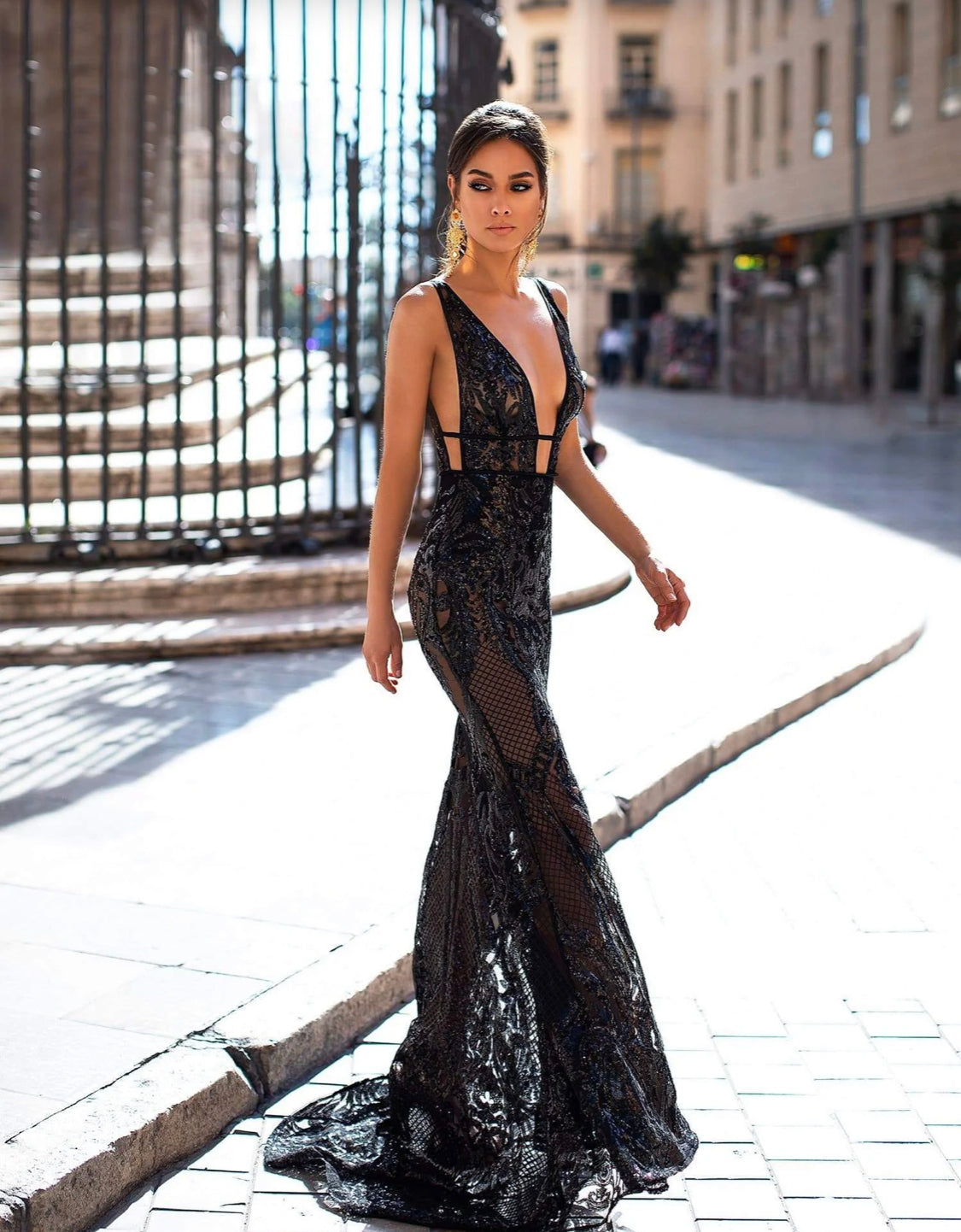Experience regal opulence in Elyse. This gown exudes an irresistible blend of glamour, adorned with an intricate sequin pattern and elegant strappy detailing at the waist and back. The allure of a shimmering black gown is both luxurious and captivating. Elyse embraces this elegance in full, with a sheer design complimented by sewn-in booty shorts.