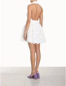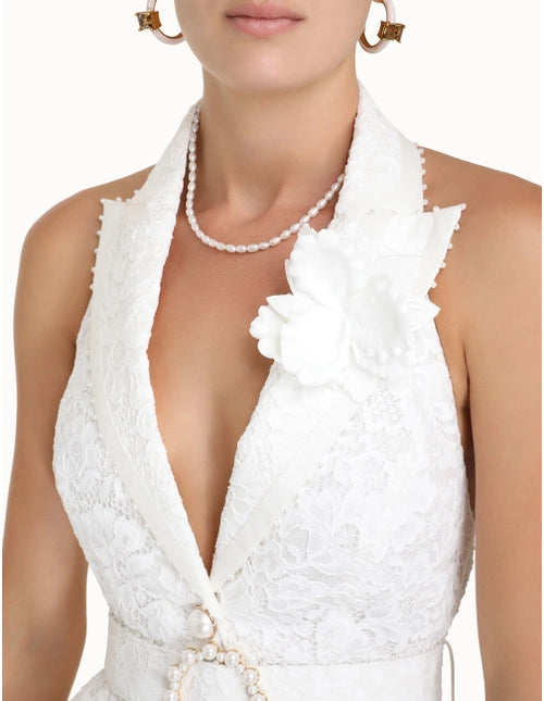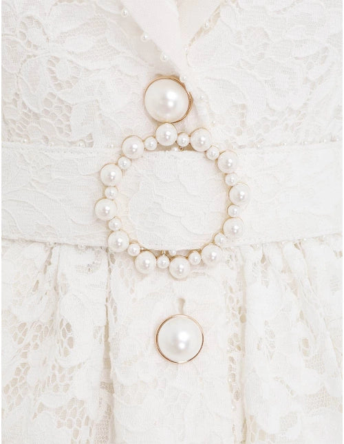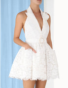 Ivory lace dressLace mini dressHalter bodicePearl trims and buttonsFull gathered skirtPatch pocketsRemovable beltCutaway back