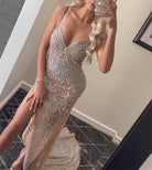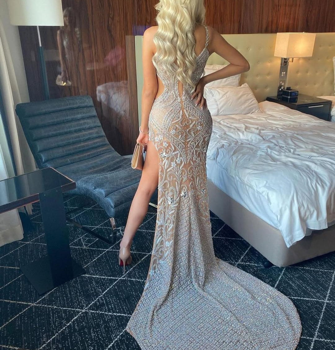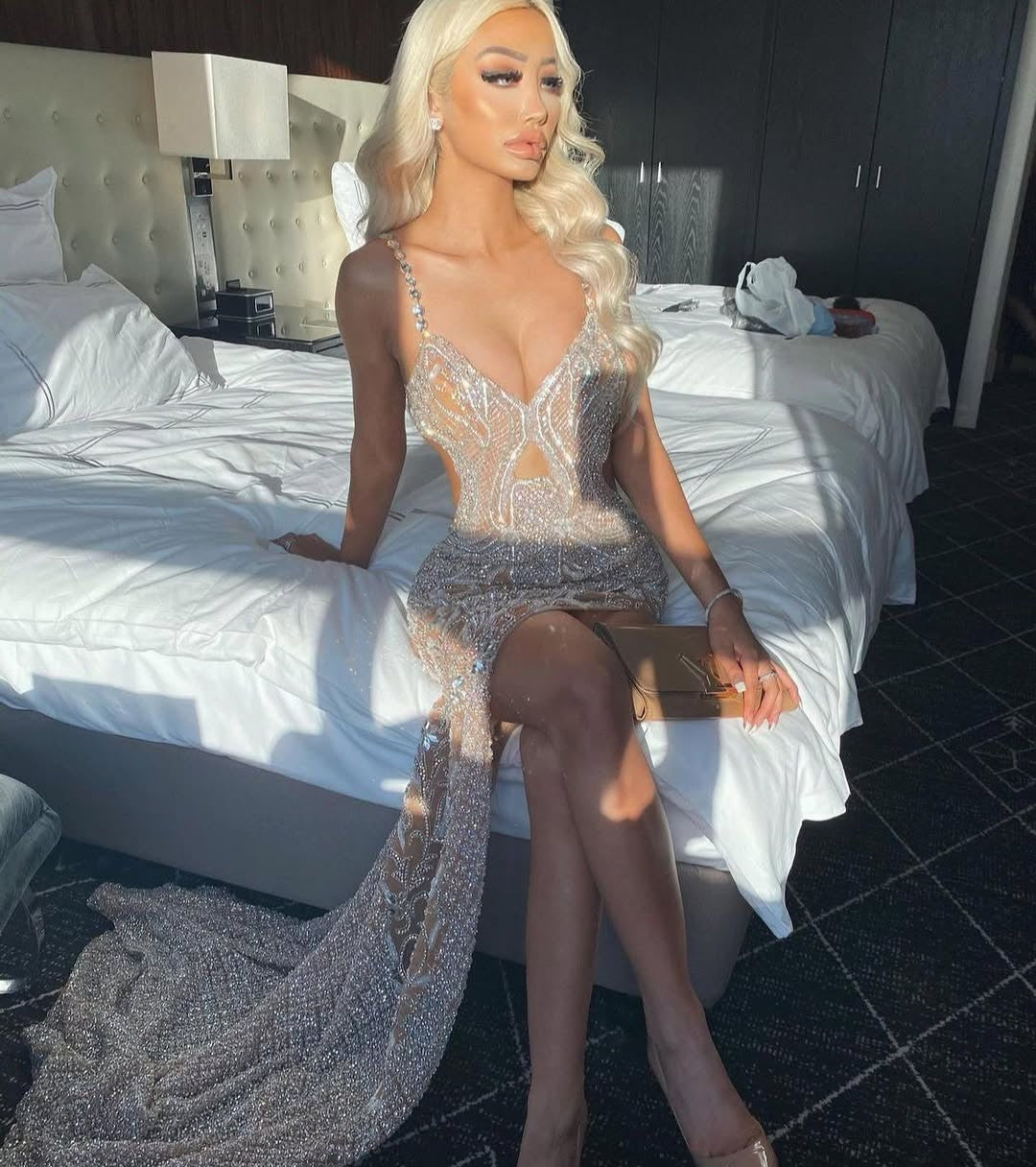 Turn heads in this stunning, figure-hugging gown featuring intricate crystal embellishments throughout. This ultra-glam dress is designed with a flattering V-neckline, sheer mesh paneling for a hint of allure, and delicate rhinestone straps that add a luxe touch. The bodycon silhouette enhances curves, while the dramatic sheer train adds a red-carpet finish. Perfect for formal events, galas, or any occasion where you want to make a statement.
