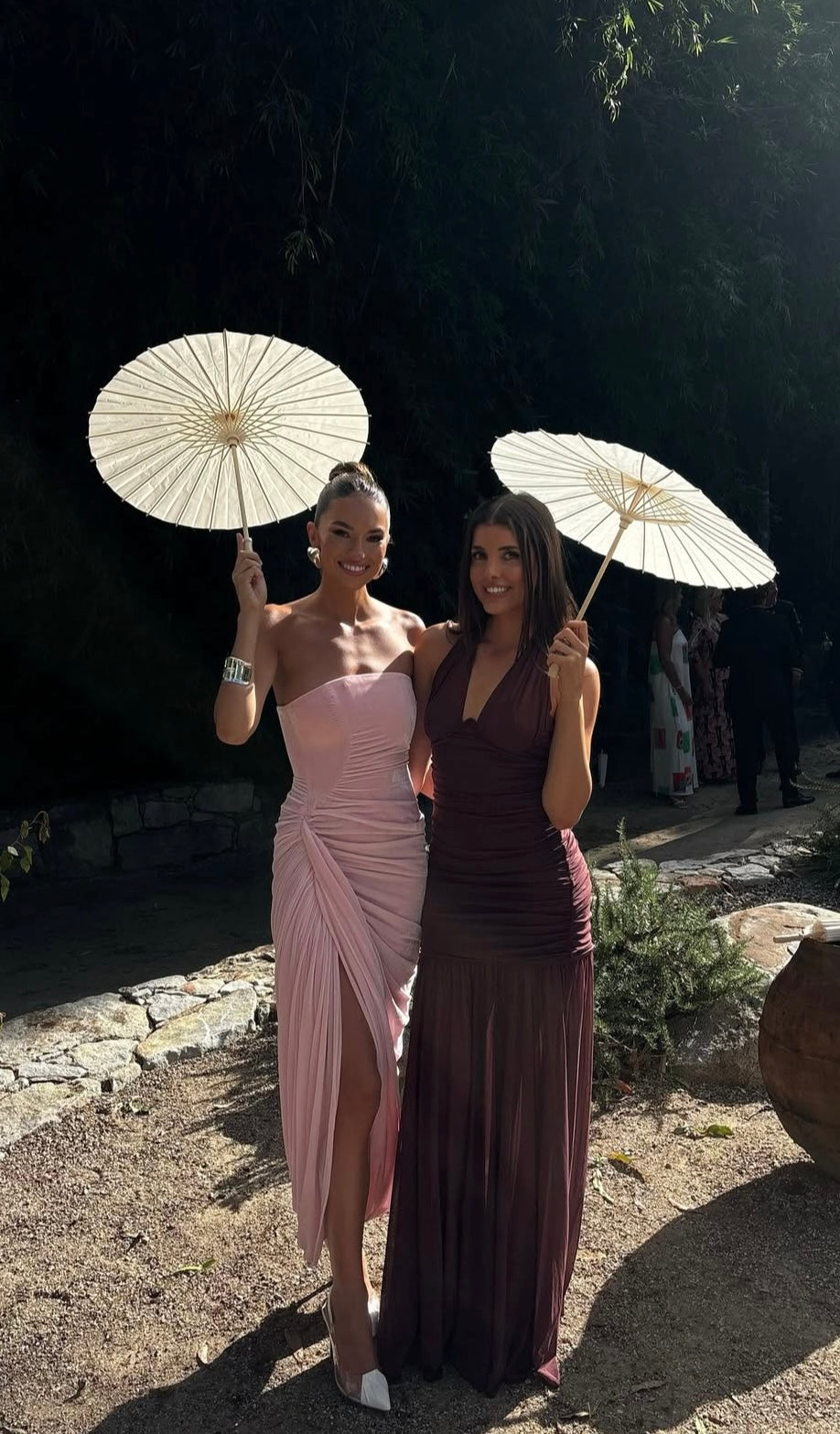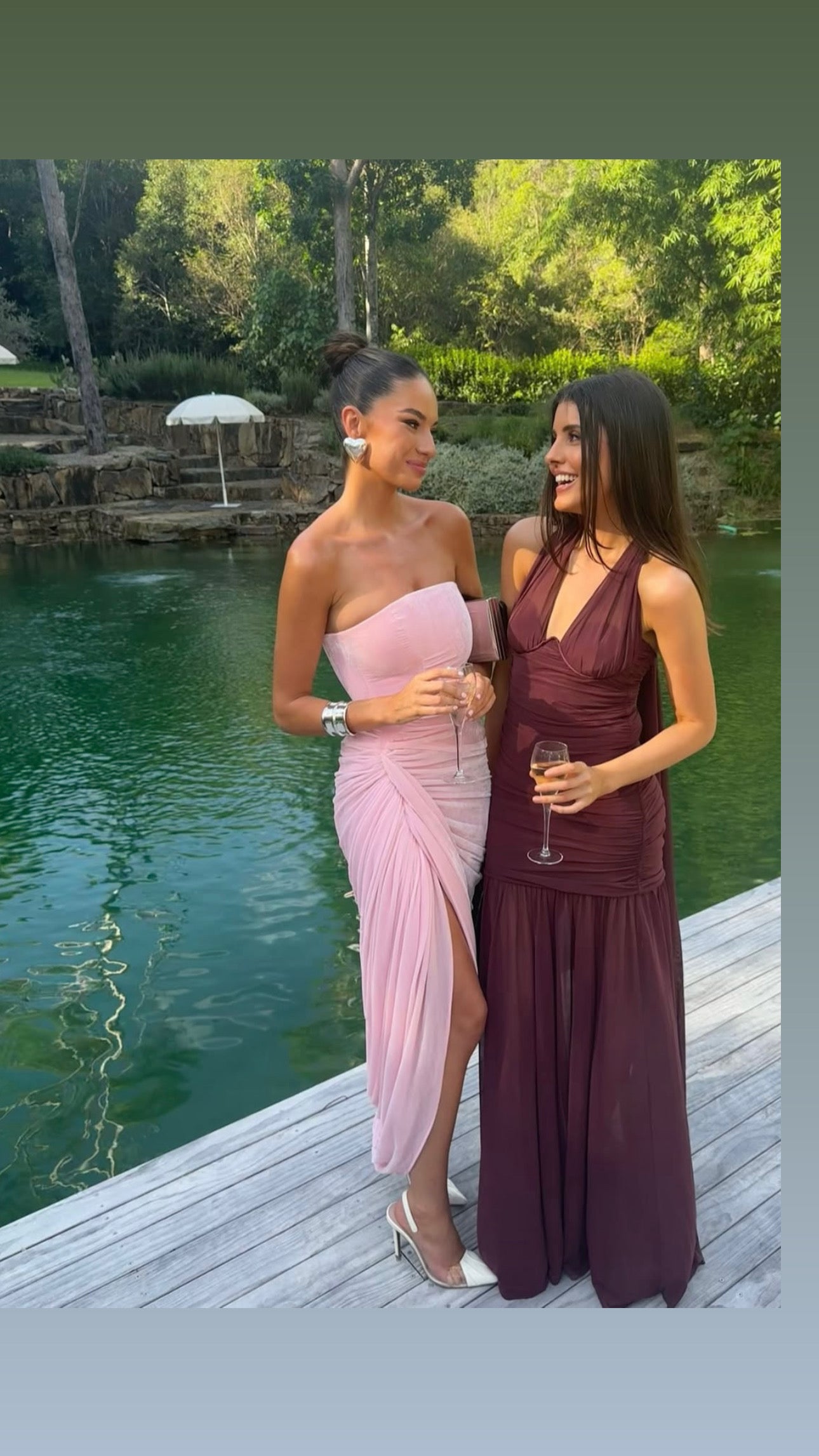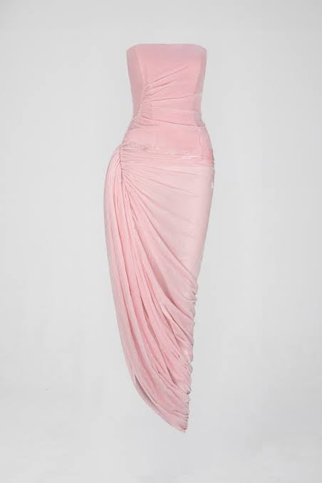 The Valerie Gown is a strapless midi featuring asymmetric drape detailing from the right hip around the hem of the dress. This opens the side of the dress for a subtle split hem detail.